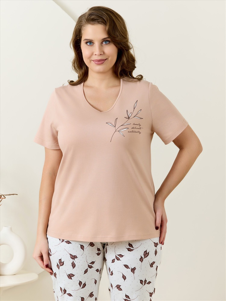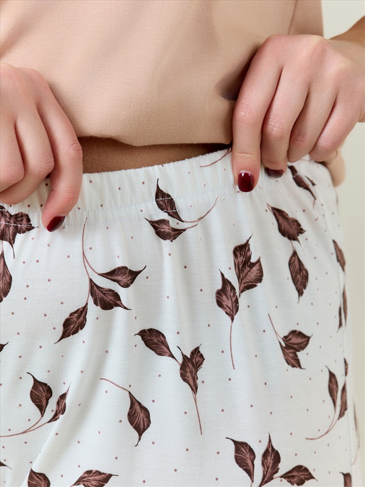 Ткань: Кулирка Кулирка - это самое гладкое и тонкое трикотажное полотно из чистого хлопка. С лицевой стороны ткань «кулирка» выглядит как «вертикальные косички», орнамент изнаночной стороны напоминает «кирпичную кладку». Свойства кулирного трикотажа- воздухопроницаемость, гигроскопичность, не теряя своей формы, практически не тянется в длину и хорошо растягивается в ширину, не образует складки. Пижама женская из трикотажного полотна «кулирка» в комбинации двух видов полотен: гладкокрашенного и с набивным рисунком, состоящая из футболки и бриджей. Футболка – из гладкокрашенного полотна, классического покроя, с короткими втачными рукавами, горловиной V-образной формы, окантованной основным материалом и принтом на полочке, выполненным в технике шелкографии.Бриджи – из полотна с набивным рисунком, свободного покроя, на притачном поясе с эластичной тесьмой внутри.