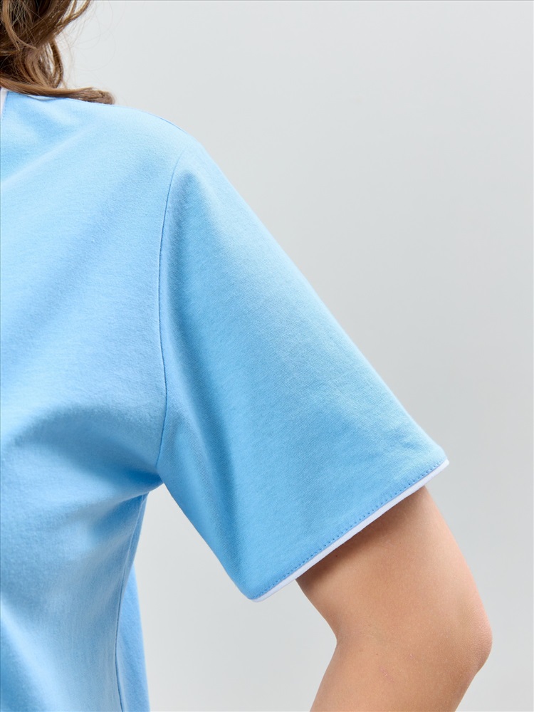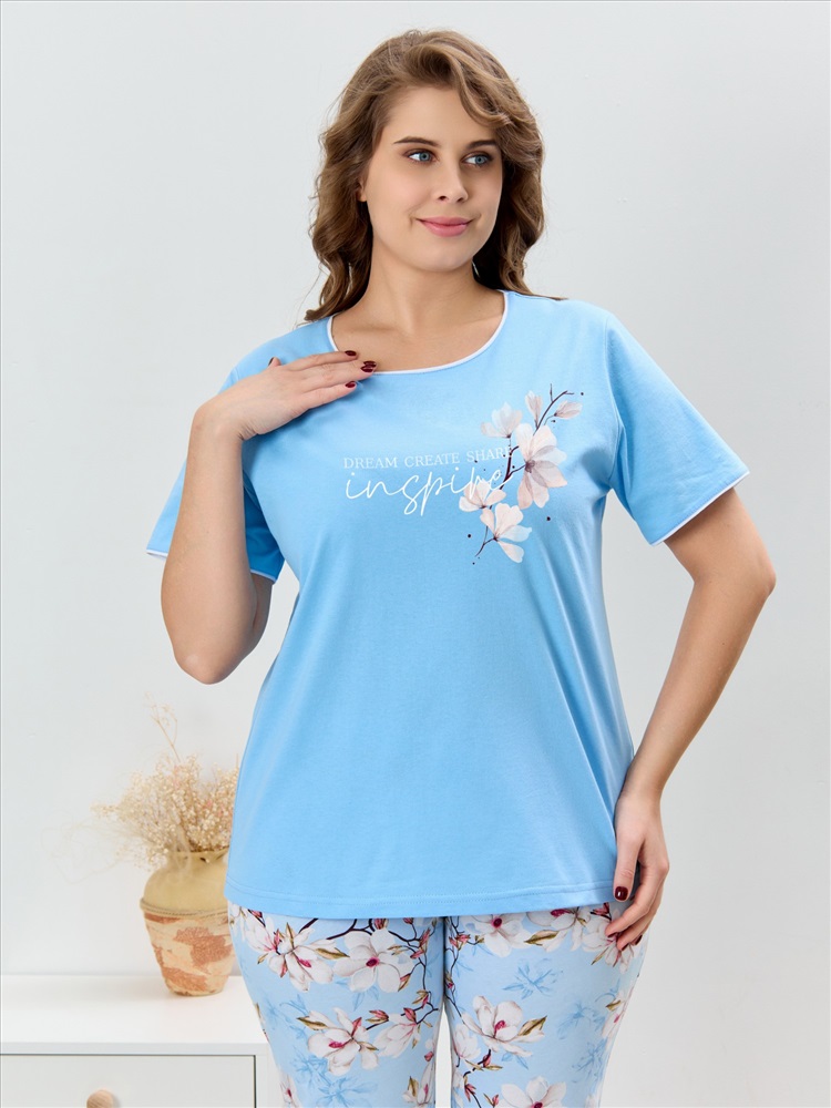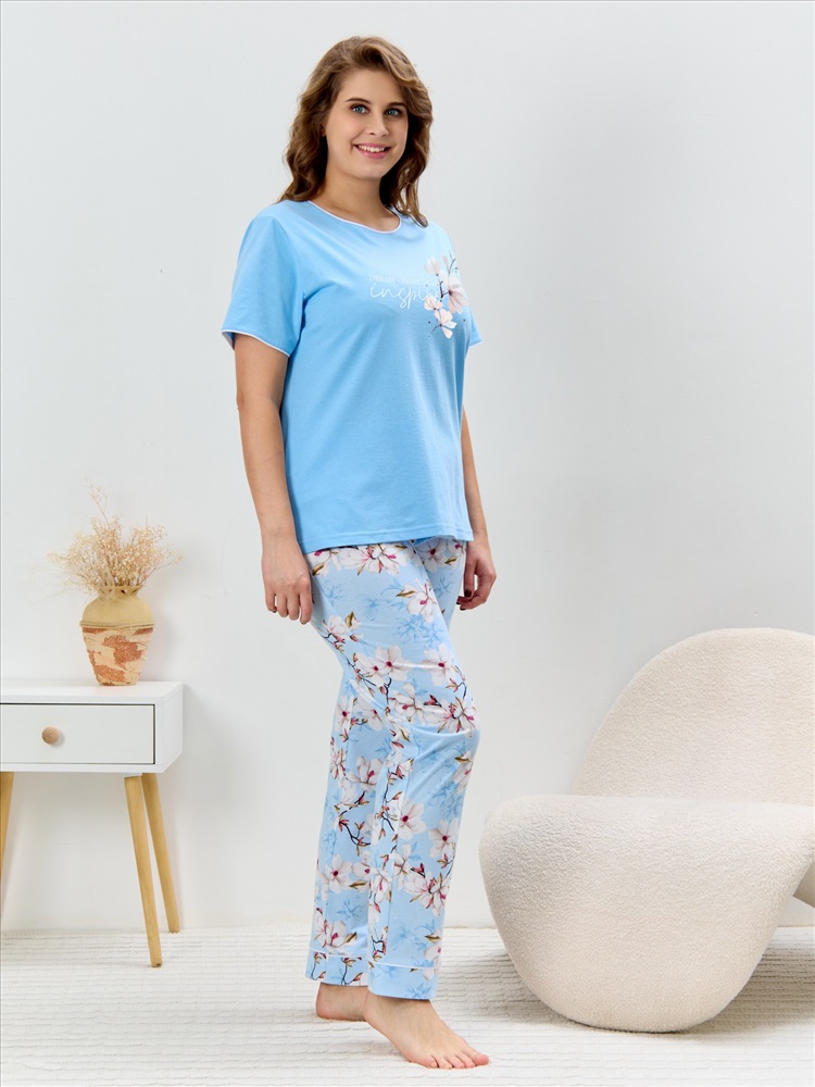 Ткань: Кулирка (пенье) Пижама женская из трикотажного полотна «кулирка» в комбинации двух видов полотен: с набивным рисунком и гладкокрашенного в единой цветовой гамме, состоящая из футболки и брюк. Футболка - из гладкокрашенного полотна, классического покроя, с короткими втачными рукавами, горловиной овальной формы и принтом на полочке, выполненным в технике «шелкографии». Горловина, низ рукавов обработаны узким притачным кантом контрастного цвета.Брюки - длинные, с эластичной тесьмой по талии и притачными манжетами, которые обработаны с узким кантом контрастного цвета в соединительных швах.