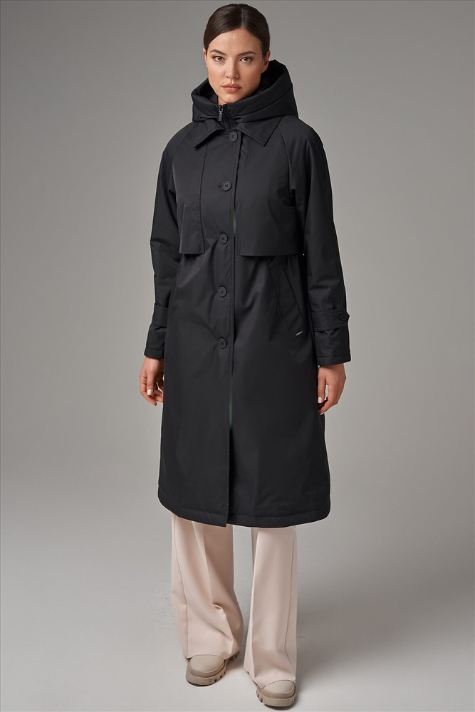 Длина изделия по спинке: 110 см Длина рукава: 64 см Плотность утеплителя: синтепон 100 г/м2 Температурный режим: от +10°C до +18°C Покрой: А-силуэт. Тип рукава: реглан. Тип карманов: прорезные с листочками на магнитах. Состав: 100% полиэстер Материал подкладки: 100% полиэстр Ткань: матовая с водоотталкивающей пропиткой. Размеры: 42-56 Детали: Съемная манишка на молнии, застежка на декоративные пуговицы. По талии есть функциональная утяжка.
