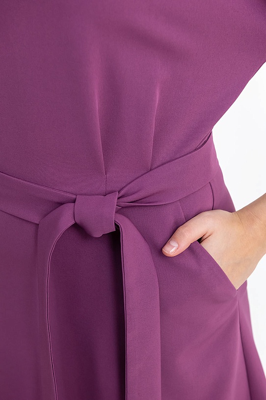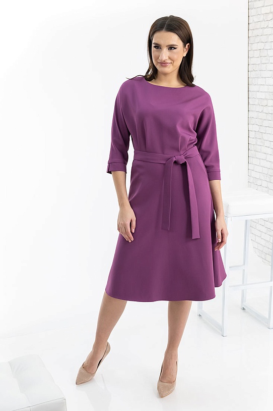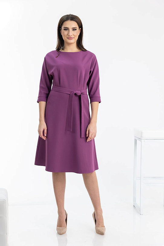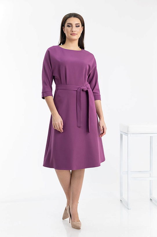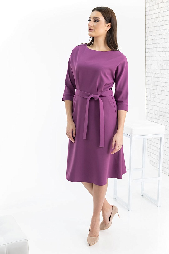 Платье приталенного силуэта с круглым вырезом и цельнокроеным рукавом 3/4. На линии талии мягкие защипы для оптимальной посадки по фигуре.Юбка А - силуэта с закругленными боками. Модель дополнена поясом. На спинке потайная молния.