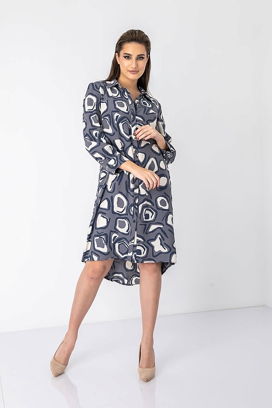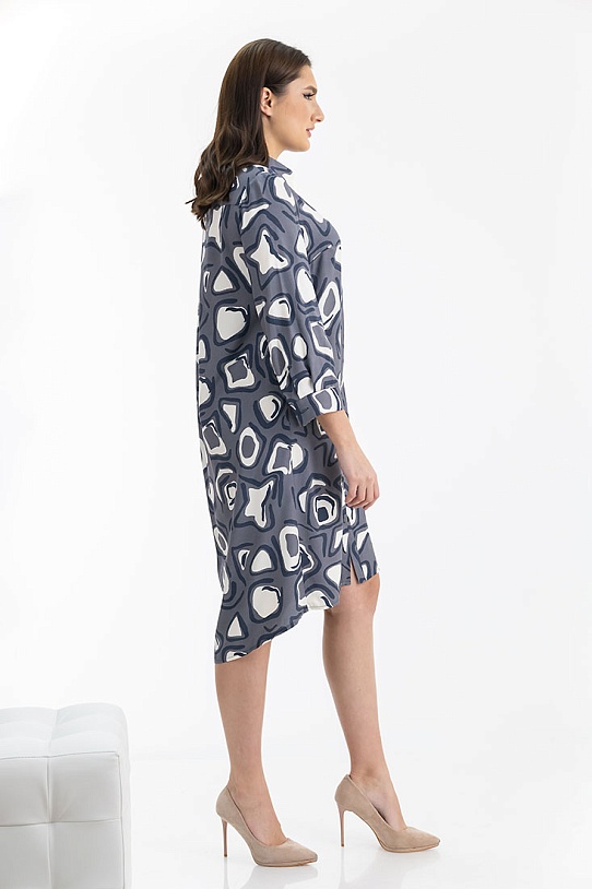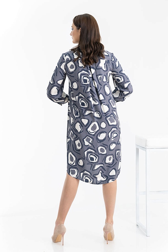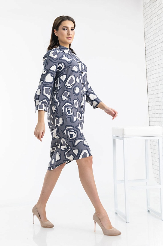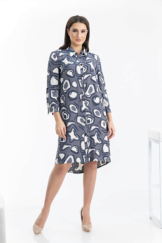 Классическое платье-рубашка прямого силуэта, выполненное из легкой струящейся ткани. Рукава 3/4 с манжетами на пуговицах. Отложной воротник на стойке. Застежка по полочке на пуговицы на планке. По спинке кокетка со встречной складкой. Спинка слегка удлиненна относительно переда.