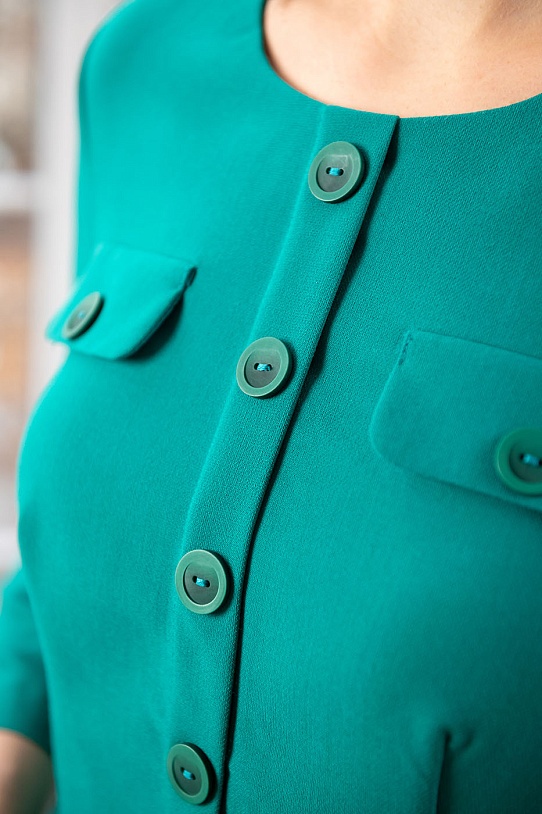 Платье полуприлегающего силуэта, отрезное по линии талии.По центру полочки до талии выполнена декоративная планка с пуговицами. По линии груди декоративные клапаны с пуговицами. Круглый вырез. Рукава 3/4. По спинке потайная молния и шлица.