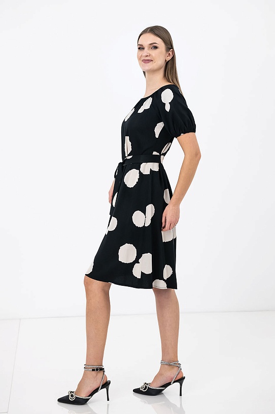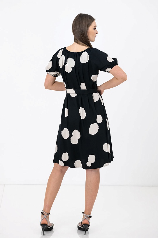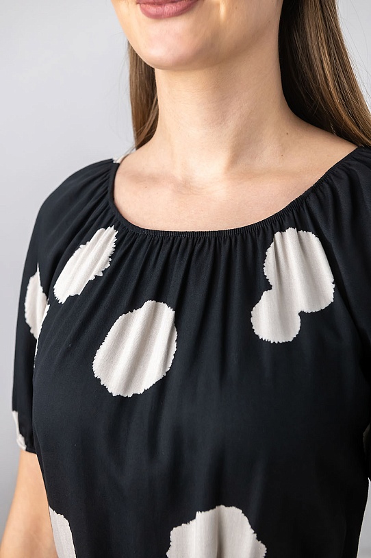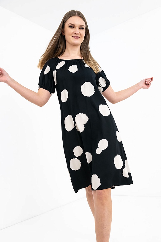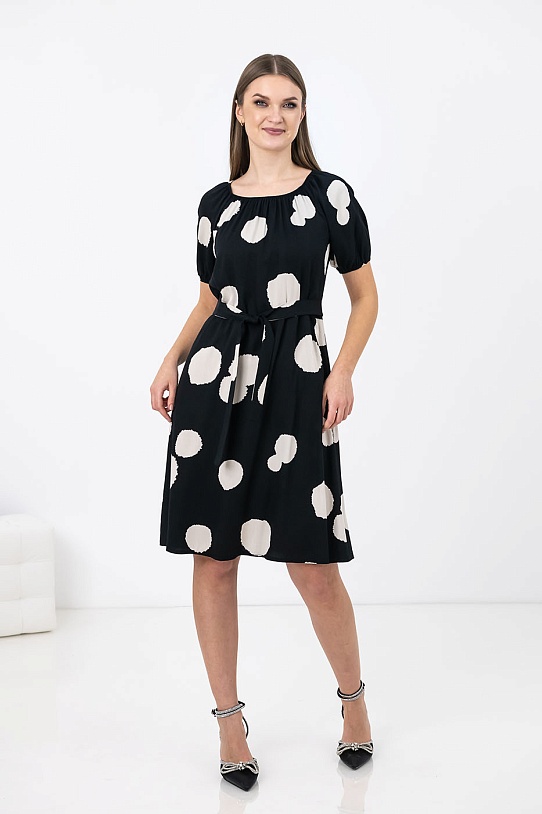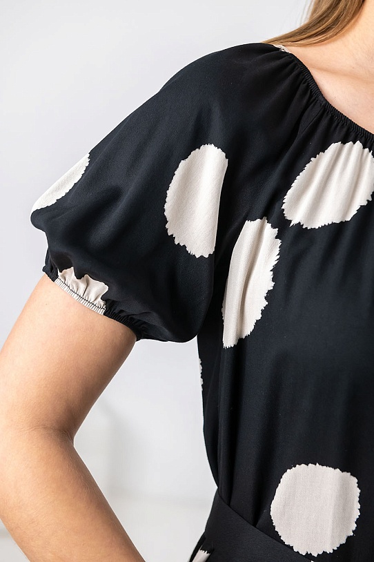 описаниеПлатье средней длинны прямого силуэта. Приталенность достигается за счет съёмного пояса из основной ткани. По горловине и рукавам проходит эластичная тесьма лента, что позволяет использовать два варианта с открытыми и закрытыми плечами. Низ рукавов собран на эластичную тесьму.