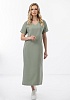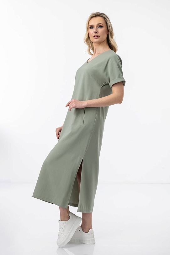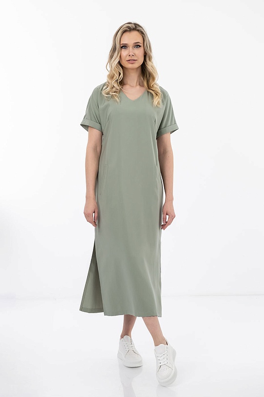 описаниеСтильное прямое платье длины миди. Цельнокроеный короткий рукав с отворотом дает свободу движениям. Кокетливые разрезы внизу по бокам. V-образный вырез, функциональные прорезные карманы.
