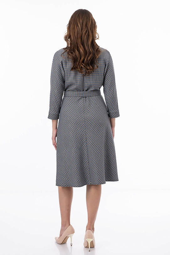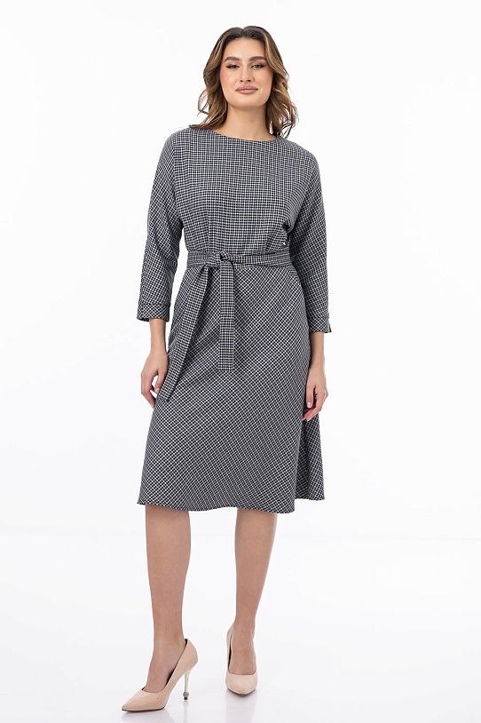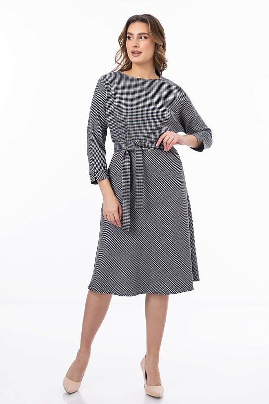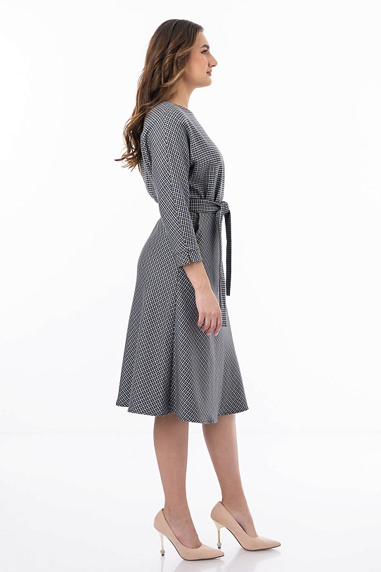 описаниеЭлегантное платье длины миди подойдет для любого мероприятия. Модель отрезная по талии, что скрыто под поясом из основной ткани. От пояса вверх сделаны небольшие сборки - это подчеркивает талию. Рукав кроя «летучая мышь» с манжетами и небольшими разрезами на них и расклешенная юбка дают свободу движениям. Под поясом по бокам функциональные карманы с отрезным бочком.