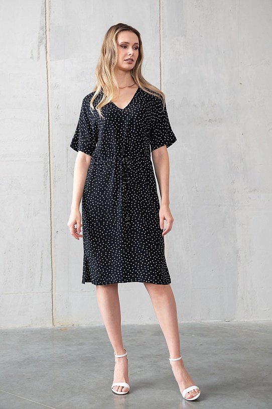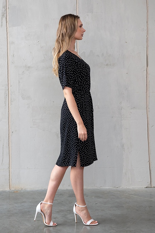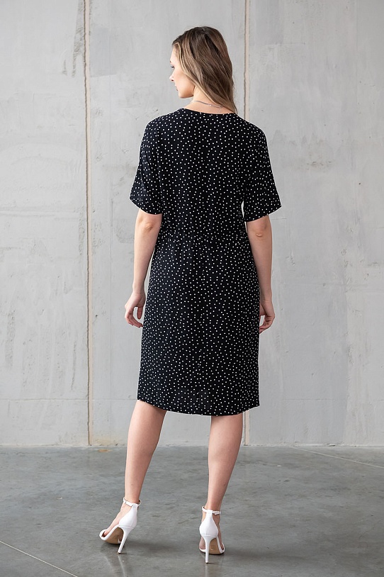 описаниеПлатье средней длины из 100% вискозы, легкое и невесомое с прекрасным всегда актуальным принтом в горошек. У Этого платья V-образный вырез средней глубины обработан окантовкой. По талии тонкая кулиска для регулировки объема. рукав этого платья цельнокройный, с отворотом по низу, длиной чуть выше локтя. Для удобства движения по бокам платья имеются разрезы. Это платье будет великолепно смотреться с белым жакетом и с белыми аксессуарами. А также, если вы хотите добавить яркости в свой образ, красные, ярко-розовые и другие насыщенные цвета будут прекрасно гармонировать с черно-белой гаммой этого изделия!