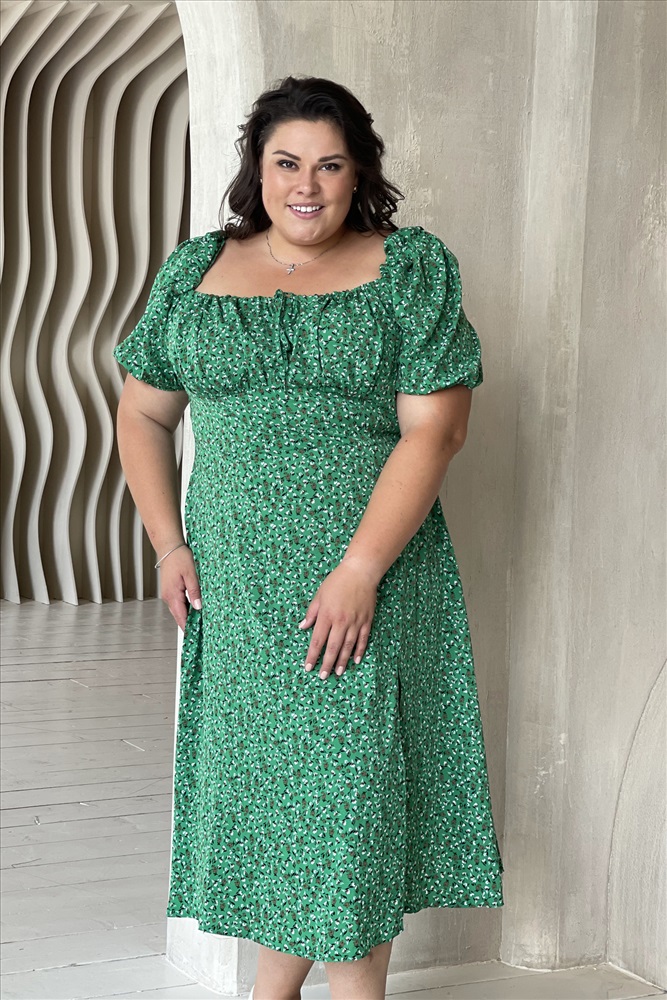 Цвет: Зеленый Фасон: Платье Длина платья: Французская длина Материал: Искусственный шелк Длина рукава: Короткий рукав Параметры модели: Рост 177 см, Размер 64 Параметр- Материал: Искусственный шелк Параметр- Цвет: Зеленый Параметр- Параметры модели: Рост 168 см, Размер 54 Параметр- Длина рукава: Короткий рукав Платье "мелкая полянка" с квадратным вырезом зеленое Лаконичное платье из мягкого материала. Женственный квадратный вырез присобран тонкой резинкой, переходящий на груди в декоративную завязку. Рукава длиной ¾ по низу присобраны тонкой резинкой. Швы по спинке обеспечивают оптимальную посадку по фигуре. Формирующий шов по переду переходит в небольшой кокетливый разрез. Модель застёгивается сбоку на потайную тесьму-молнию. Мелкий растительный принт освежает образ и добавляет динамичности. Отрезная по линии талии юбка создает женственный силуэт и искусно обыгрывает фигуру в области бедер.Элегантное платье отлично подойдет как для повседневной но́ски, так и для торжества. Яркий клатч и туфли на каблуках станут идеальным дополнением к стильному образу.
