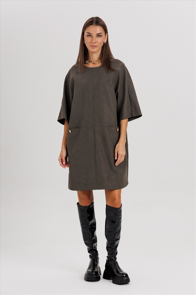 Стильное платье прямого силуэта — идеальный выбор для женщин, которые ценят комфорт и современный дизайн. Модель выполнена из плотной ткани с легкой фактурой, что обеспечивает безупречную посадку и сохранение формы в течение дня. Платье имеет декоративные металлические элементы у линии карманов, что придает образу современный акцент. Универсальная длина до колена позволяет сочетать модель как с высокими сапогами, так и с ботильонами или обувью на плоской подошве. Особенности модели: Прямой силуэт, цельнокроенный покрой Плотная, слегка фактурная ткань Рукава до локтя Длина до колена Округлый вырез горловины Декоративные элементы у карманов Универсальный стиль — подойдёт для офиса, прогулок и встреч ПЭ-100% Комментарии к товару