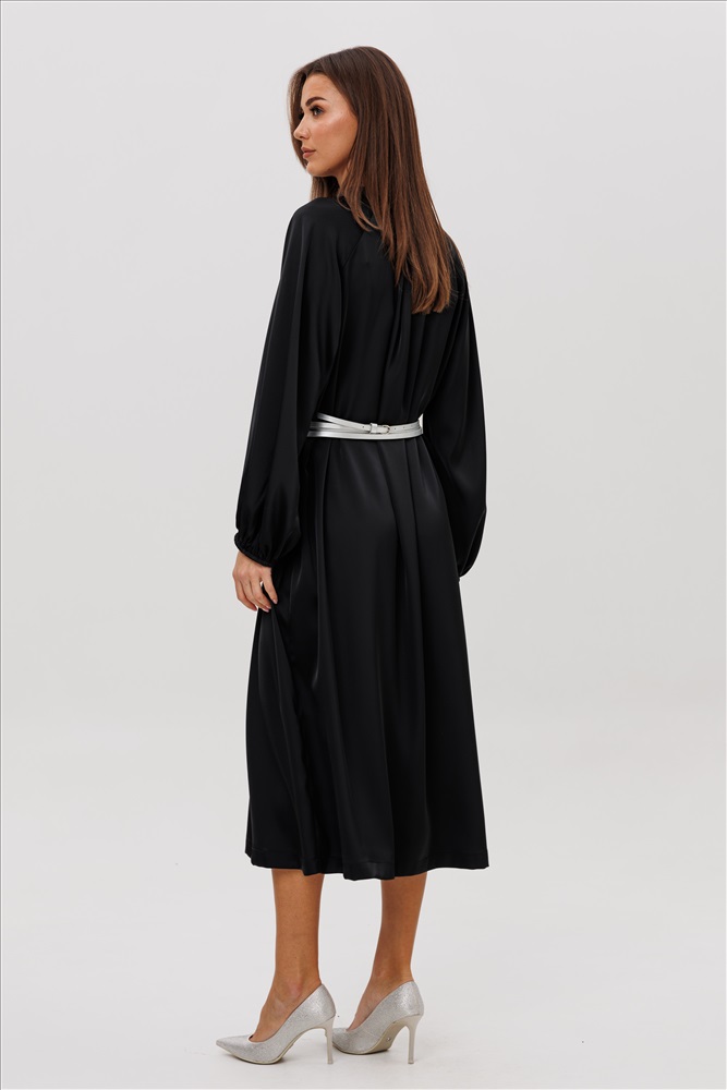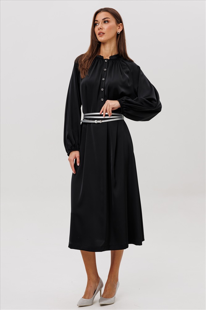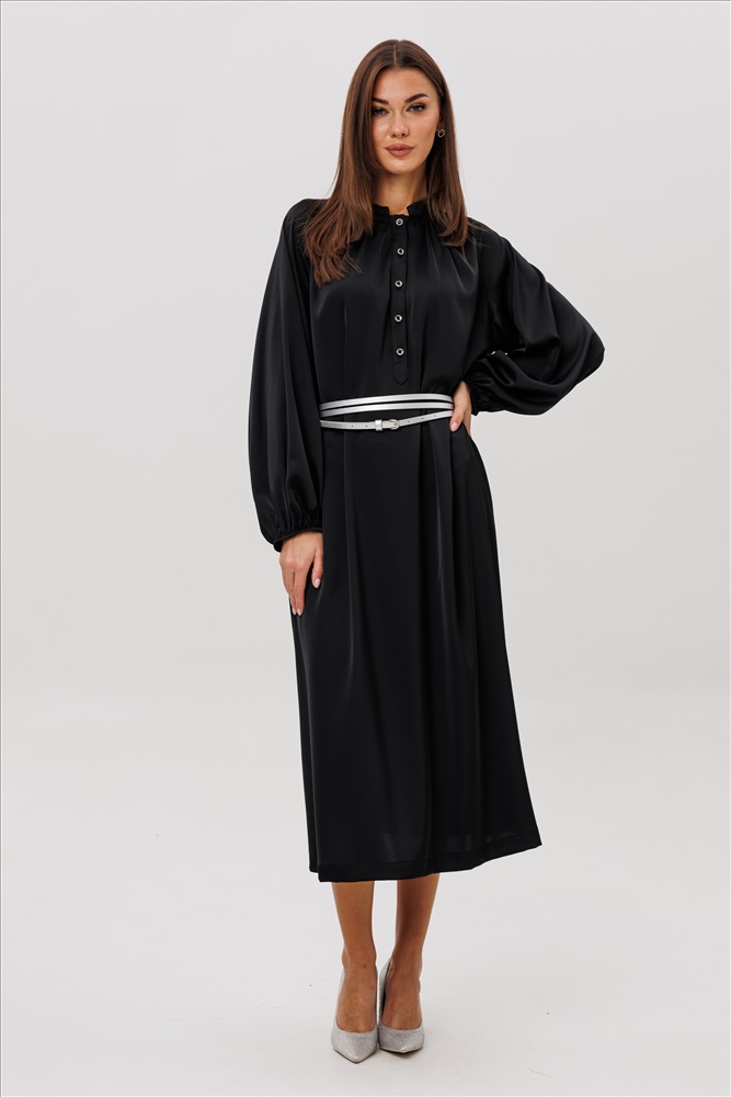Платье из гладкого атласного полотна свободного рубашечного покроя. Модель выполнена с мягкой сборкой по горловине, застёжкой на пуговицы и объёмными рукавами на манжете. Акцентом выступают эффектные серебристые пояса, подчёркивающие талию и добавляющие образу современный, элегантный штрих. Ideal для деловых встреч, ужинов и особых выходов. ПЭ 100% Комментарии к товару