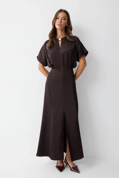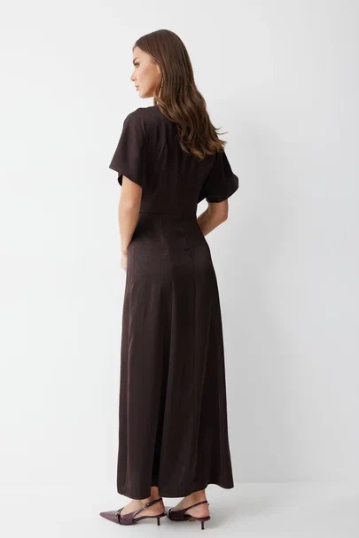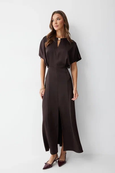 Нарядное платье из струящейся ткани длины макси. Рукав цельнокроеный. Платье отрезное по линии талии, на полочке заложены складки. Горловина округлая, с декоративно протяжкой по центру. По спинке средний шов с застежкой на потайную молнию. Юбка расширенна книзу от бедра. Обращаем ваше внимание, что фурнитура может незначительно отличаться от фото.