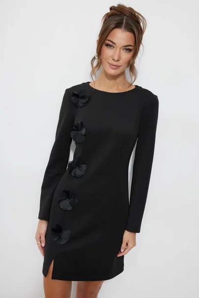 Нарядное платье из трикотажного полотна, длина мини. Платье прилегающего силуэта с небольшим расширением по низу. С рельефами по переду и спинке. По переду слева вдоль рельефа пришивной декор «цветы». По переду слева рельеф с разрезом по низу. Рукав втачной, длинный. Вырез горловины «лодочка». Потайная молния в среднем шве спинки. Обращаем Ваше внимание, что декор может незначительно отличаться от фото.