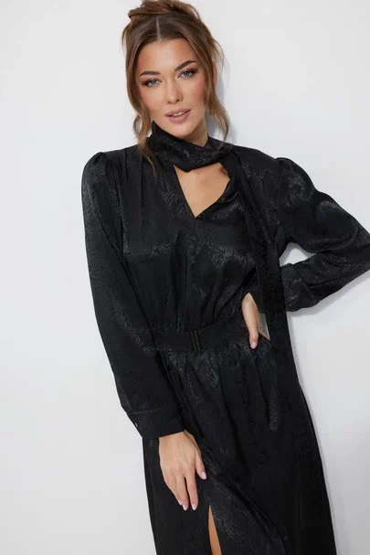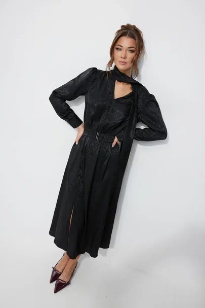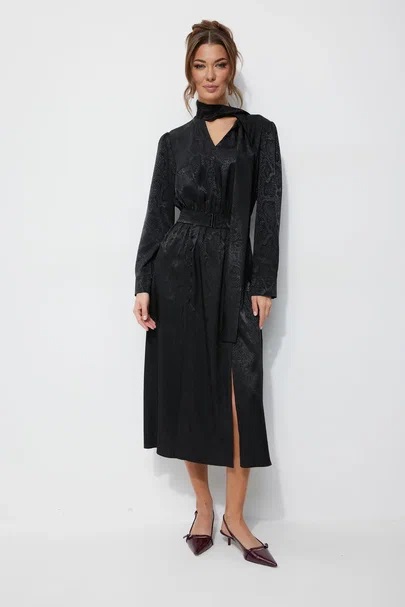 Нарядное платье из жаккардового атласа с анималистичным дизайном. Платье свободного кроя. Отрезное по талии, с резинкой. Рукав длинный, с манжетой с застежкой на петлю с пуговицей. Платье с мягким воротником-стойкой, переходящим в бант-завязки по переду. По переду V-образный вырез по горловине. По переднему полотнищу юбки шлицы в рельефах, рельефы от талии до шлиц декорированы пуговицами. Платье дополняется съемным поясом из основной ткани, с пряжкой. В среднюю часть пояса вставлена резинка. Обращаем Ваше внимание, что фурнитура может незначительно отличаться от фото.