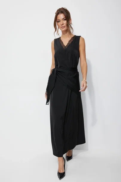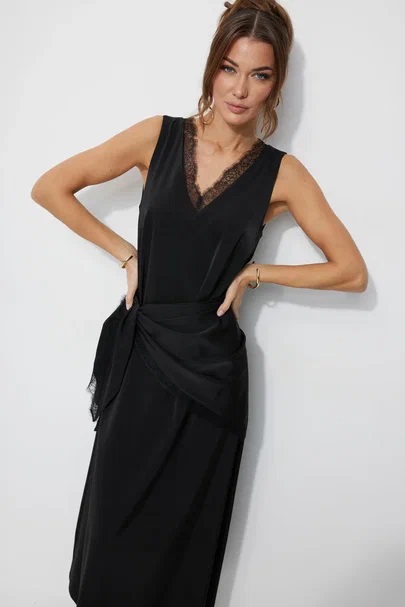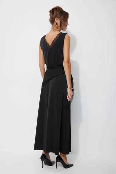 Нарядное платье из струящейся ткани, длина макси. Платье свободного кроя, прямое, расширенное к низу. С глубоким V-образным вырезом горловины по переду и спинке, декорированным французским кружевом. По переду нагрудные вытачки. Без рукава. Платье дополняется платком из основной ткани. Платок декорирован по двум срезам французским кружевом. Обращаем Ваше внимание, что кружево может незначительно отличаться от фото.