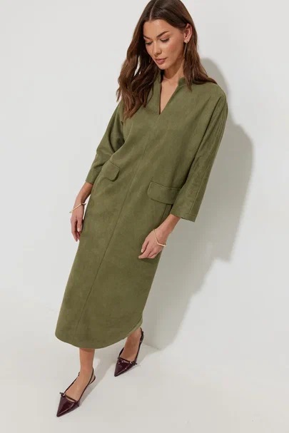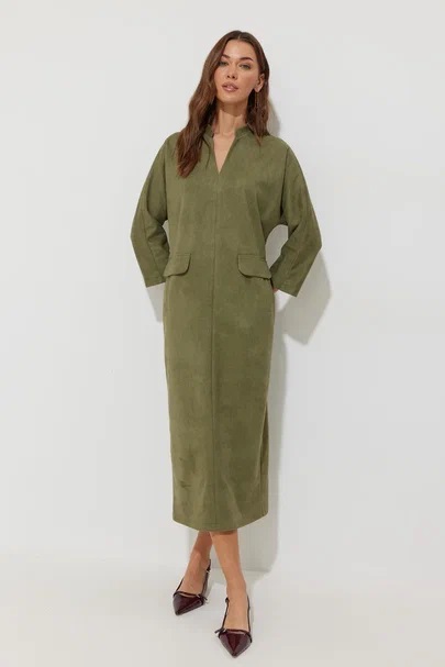 Платье прямого силуэта из трикотажного полотна длины миди. Рукав цельнокроеный, длиной ¾. Воротник-стойка. На передних половинках обработаны прорезные карманы с втачной листочкой и декоративным клапаном. По спинке расположен центральный шов с шлицей по низу.