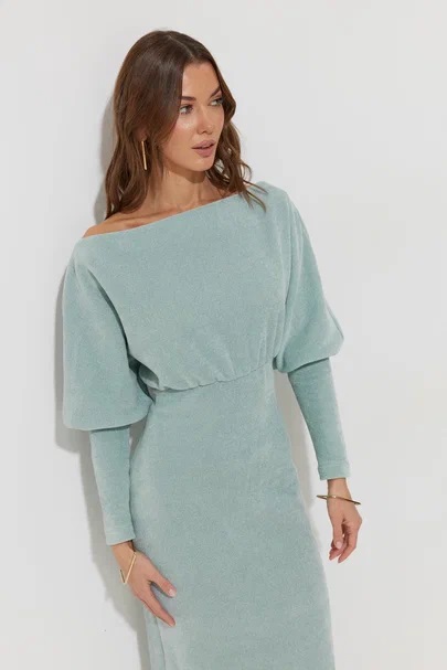 Платье полуприлегающего силуэта из трикотажного полотна. Горловина-лодочка. Рукав цельнокроеный, с подрезом выше уровня локтя и узкой длинной манжетой. По переду и спинке выше линии талии подрез, в который вставлена резинка. Обращаем ваше внимание, что ремень в комплект не входит.