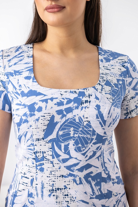 описаниеЛаконичное платье с коротким рукавом прилегающего силуэта. Необычный прямоугольный вырез. Сзади внизу шлица.