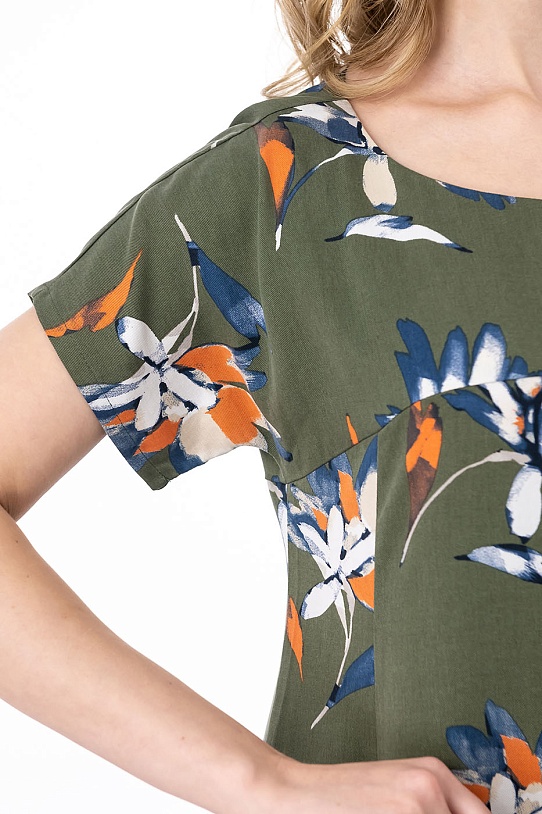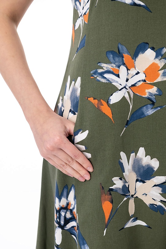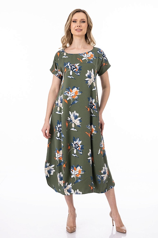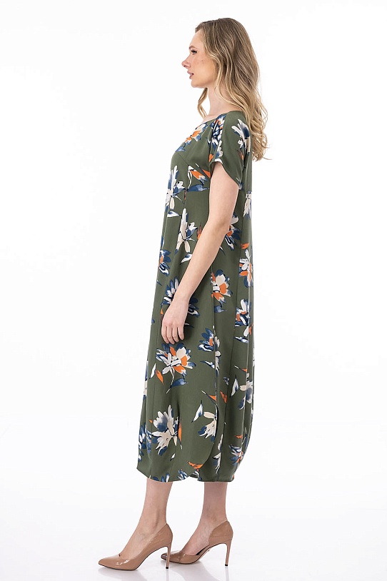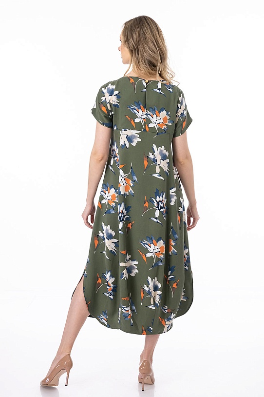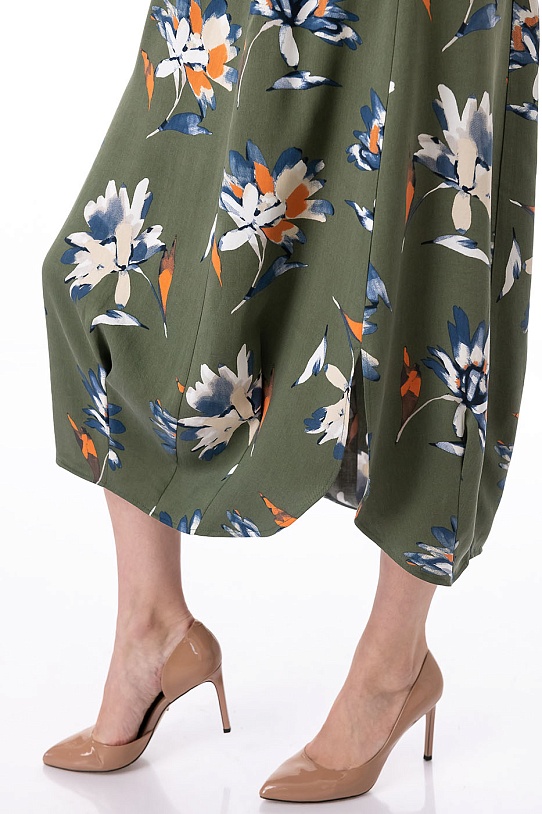 Комфортный вариант для повседневных прогулок в летнее время. Платье выполнено в стиле бохо. Низ юбки частично закруглен, объем снизу увеличен засчёт складок. Красивый, овальный вырез обработан обтачкой и плавно открывает шею. В области груди сделан горизонтальный подрез, благодаря которому платье идеально сядет на любую форму груди. Засчет немного зауженного верха и расходящегося от груди низа - платье визуально сужает талию и придаёт фигуре женственные очертания. Нижняя часть достаточно свободного силуэта зауженного к низу искусно маскирует область талии и живота. Такой фасон свободного кроя подойдёт для любого типа фигуры!