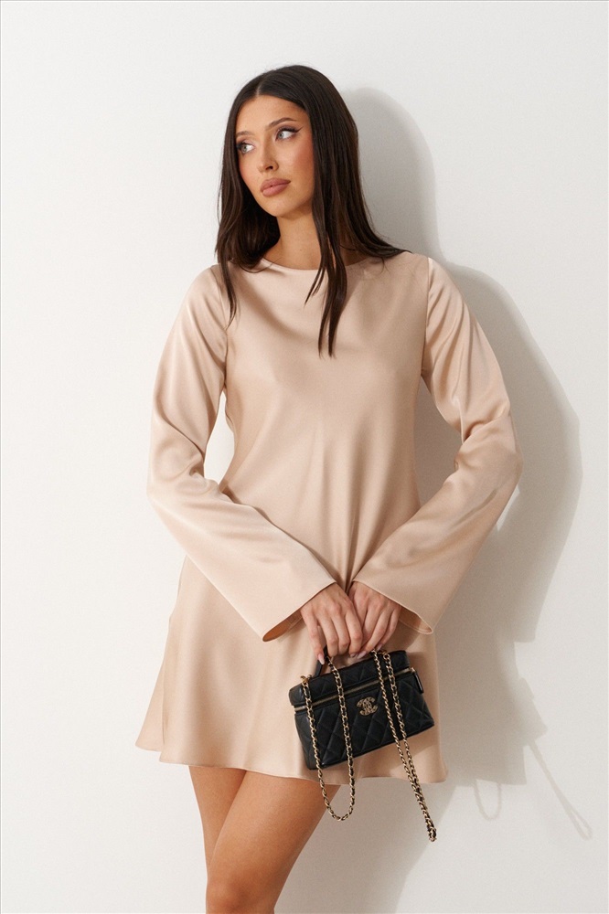 Платье короткое. Выполнено из тонкого атласа в жемчужно-бежевом оттенке. Характеристика: По полочке вырез лодочкой, по спинке глубокая качель с перемычкой по центру. По верху горловины спинки шнурки-завязки. Рукав длинный, одношовный, втачной, с расклешением к низу. Низ юбки с расклешением к низу. Длина рукава 65 см, длина платья по спинке от плеча 84 см.