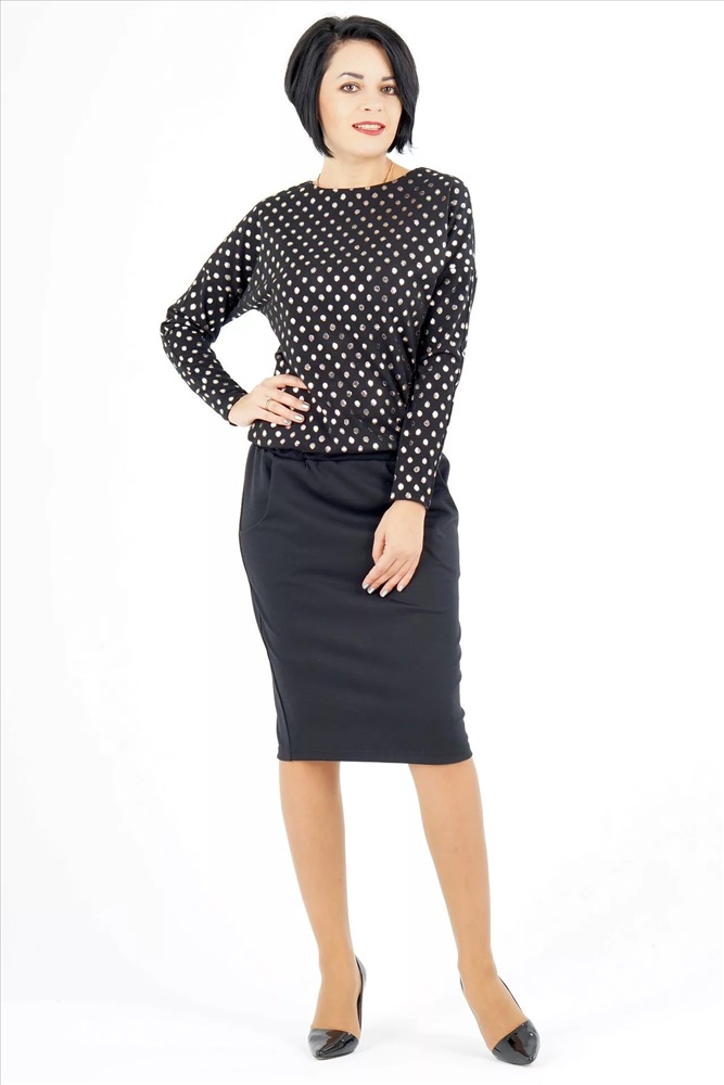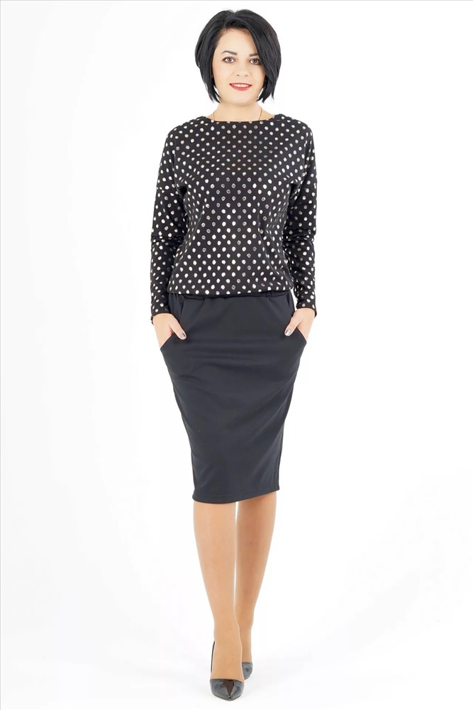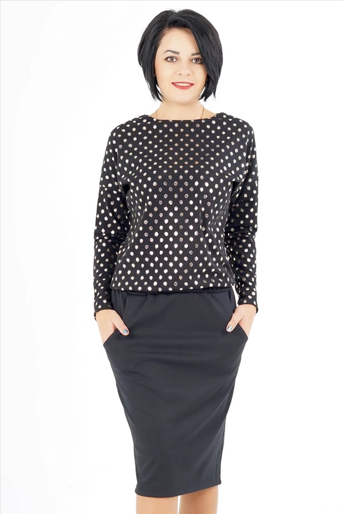 Материал: Трикотаж плотный Тип: Повседневная Сезон: Осень-Зима Цвет модели: Золотой горох на чёрном, черный Страна производства: Россия Платье свободного силуэта. Выполнено верх из вязаного трикотажного полотна с люрексом, низ из плотного трикотажа. Круглый вырез горловины. Цельнокроеный рукав 65 см. Пояс на широкой резине. С карманами. Застёжка пуговица по спинке. Без подклада. ДИ в 42-46 р 115 см, в 48-50 р 119 см, в 52-54 р 124 см. Рост модели 164 см. , 42 размера Комментарии к товару