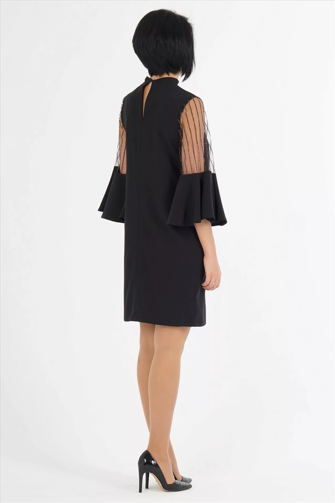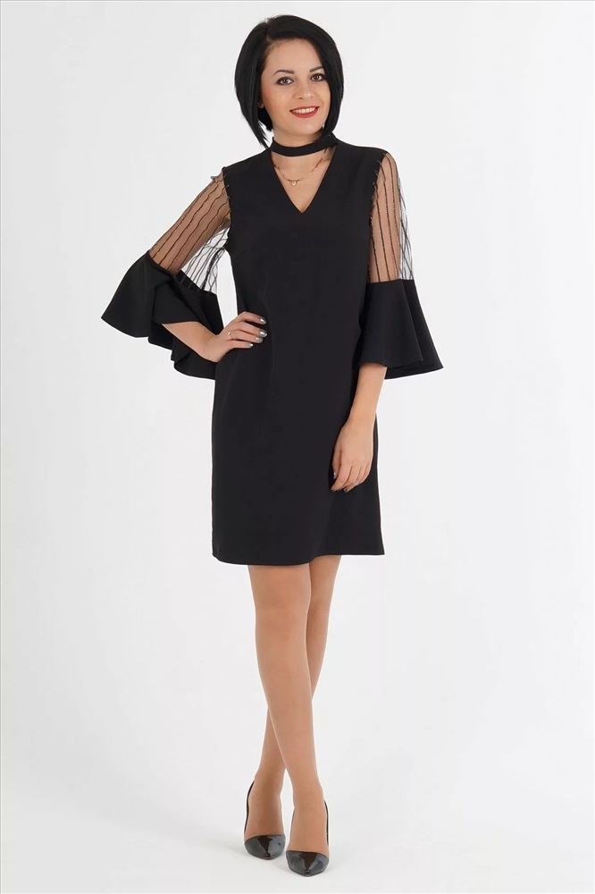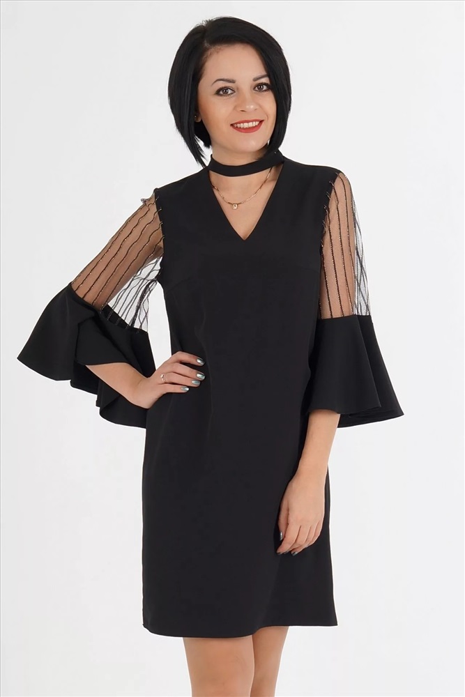 Материал: Плательная ткань Тип: Повседневная Сезон: Осень-Зима Цвет модели: Чёрный Страна производства: Россия Нарядное платье А силуэта из плательной ткани. V-образный вырез горловины, декорированный стойкой-чокером. Рукава втачные с декором из сетки с люрексом, длина 45 см. Застежка пуговица по спинке. Без подклада. Низ прямой. ДИ в 42-44 р 87 см., в 46-48 р 91 см., в 50-54 р 96 см. Рост модели 164 см. , 42 размера Комментарии к товару