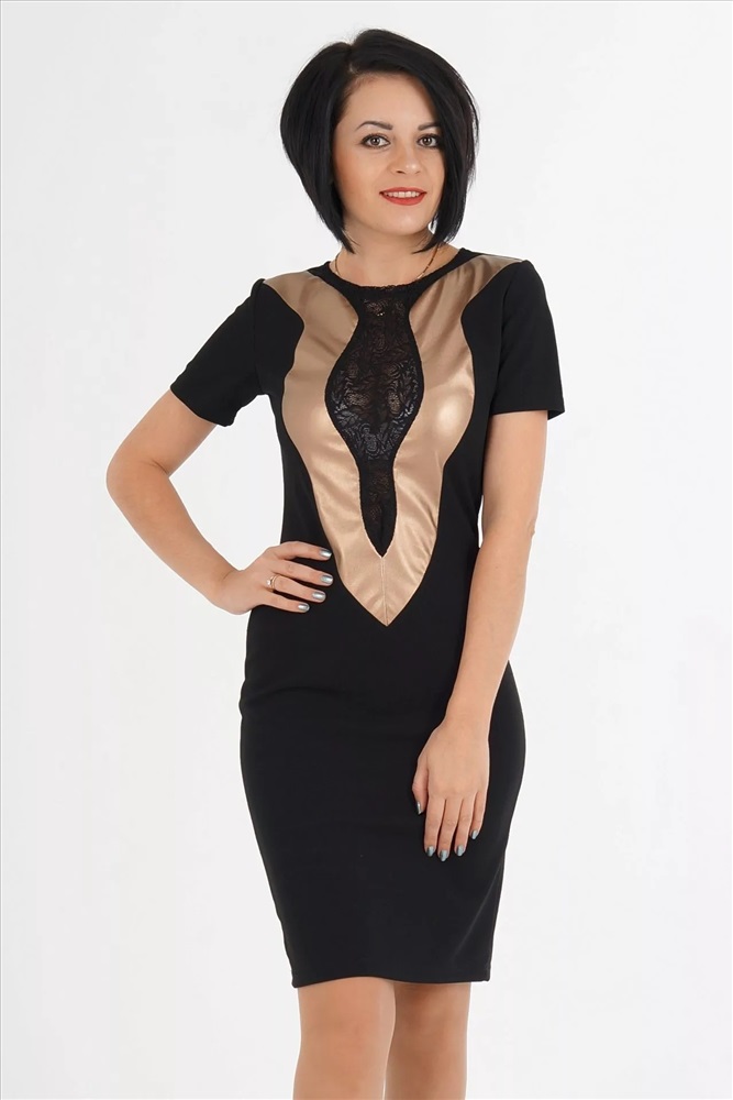 Перед платья декорирован вставкой из эко-кожи и гипюра.