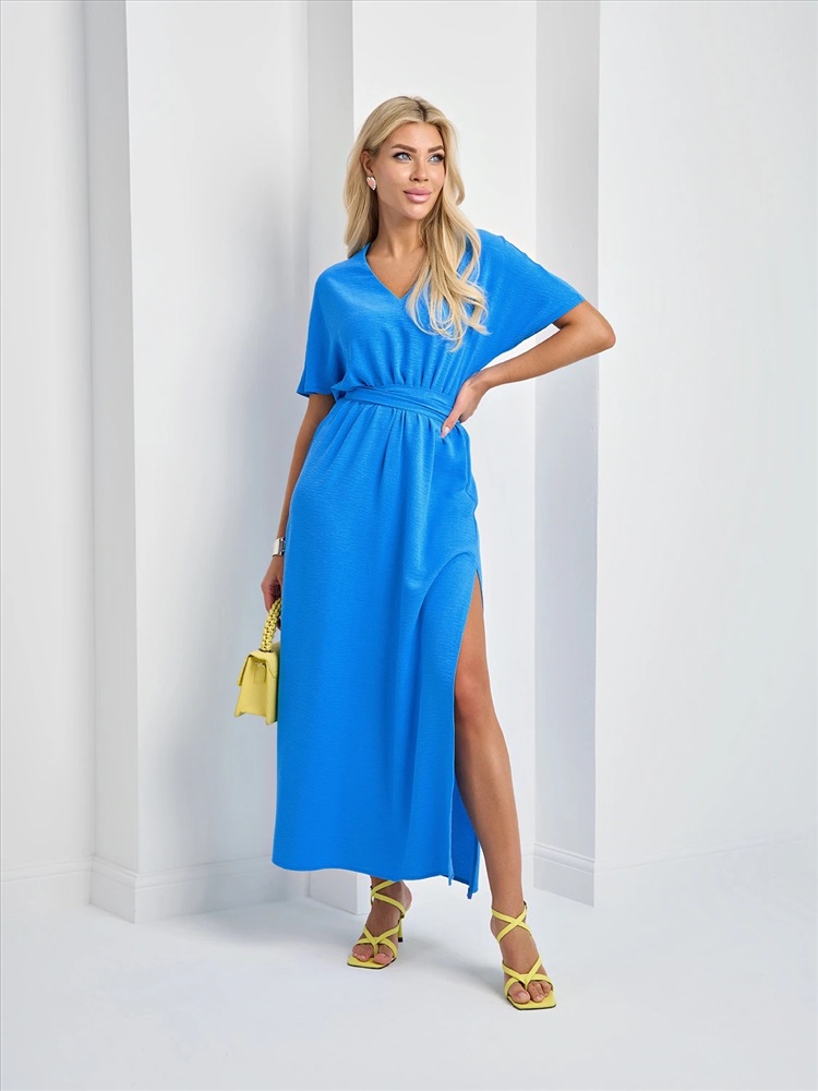 По переду V-образный вырез. В боковых швах-высокие разрезы. Талия отрезная на резинке. В комплекте идет пояс. Комментарии к товару