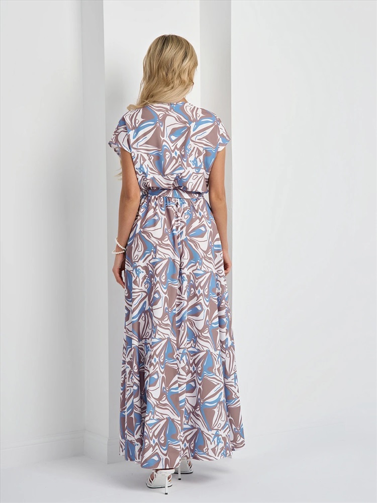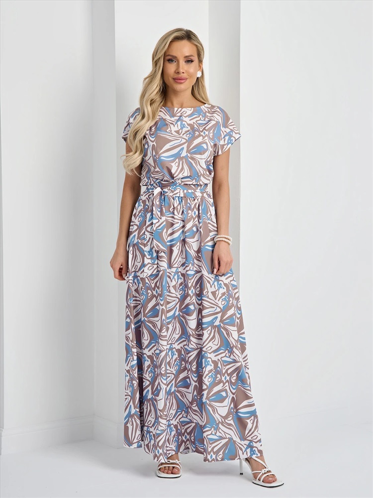 Отрезное по линии талии, на резинке. Талия декорирована поясом из основной ткани. Низ изделия расклешенный. Короткий цельнокроеный рукав. Комментарии к товару