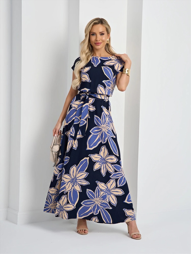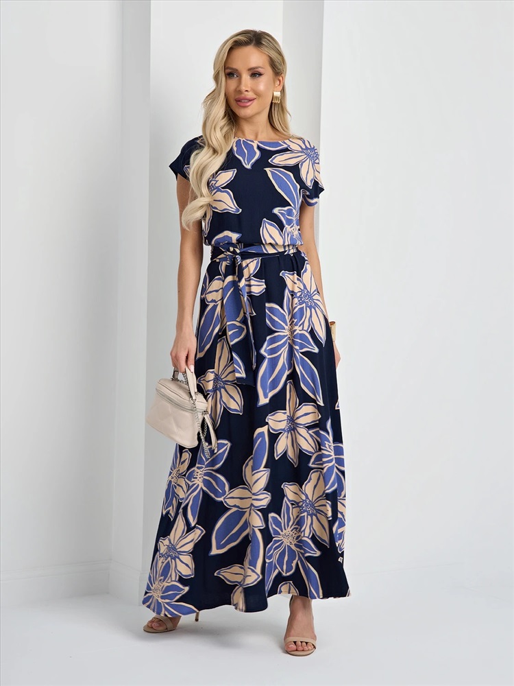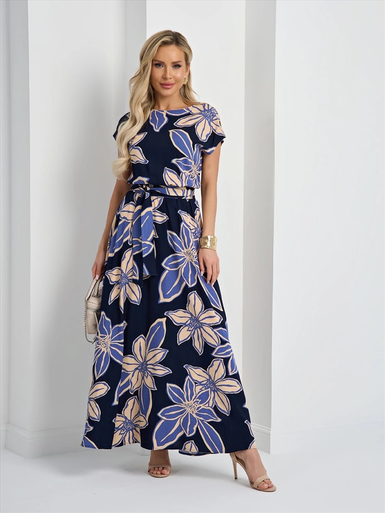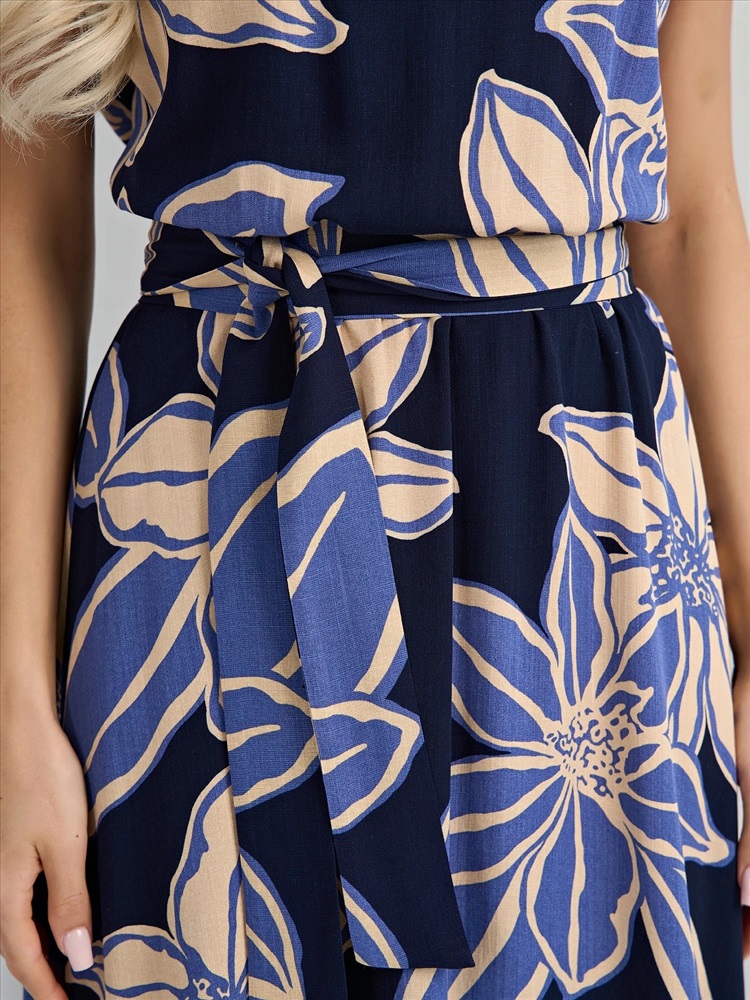 Отрезное по линии талии, на резинке. Талия декорирована поясом из основной ткани. Низ изделия расклешенный. Короткий цельнокроеный рукав. Комментарии к товару