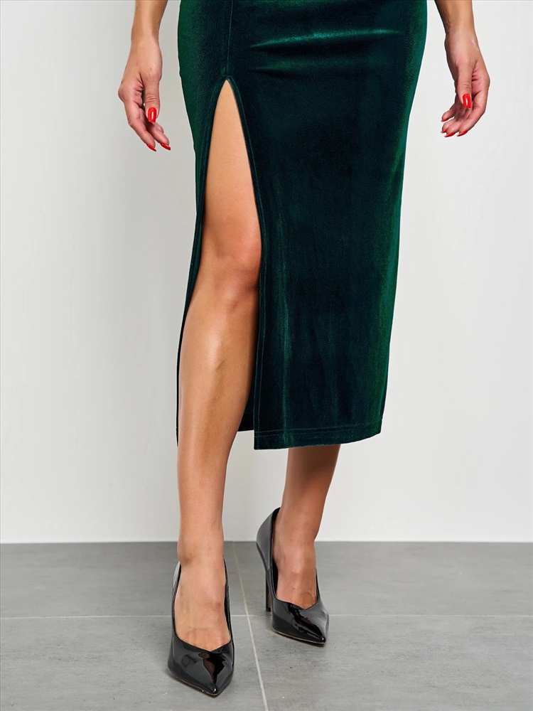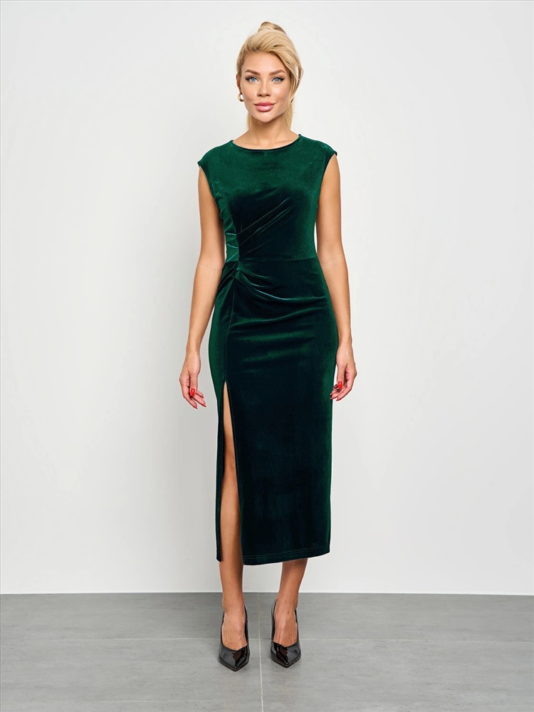 Возможны другие незначительные дефекты. Вечернее платье прилегающего силуэта, выполненное из нежнейшего бархата. По переду изделия на линии талии складки, визуально формирующие силуэт. По переду изделия высокий разрез. Комментарии к товару