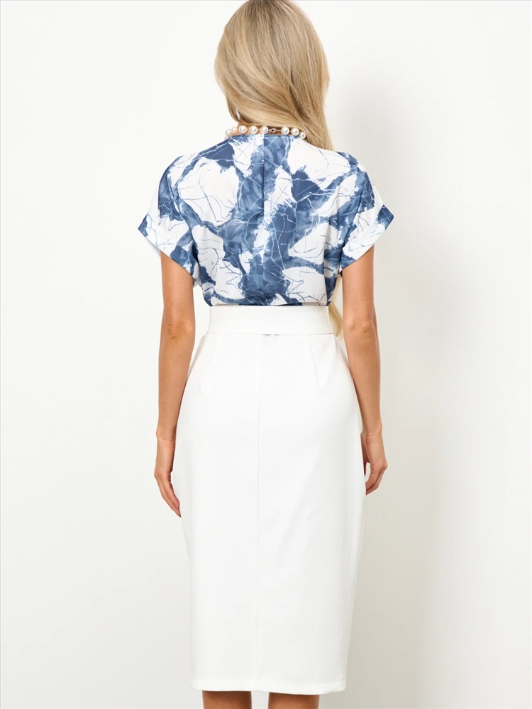 Низ изделия выполнен из костюмной однотонной ткани. Верх выполнен из платьельной ткани с принтом. Платье имитирует запах по верху и низу изделия. В комплекте идет пояс из костюмной ткани с пряжкой. Комментарии к товару