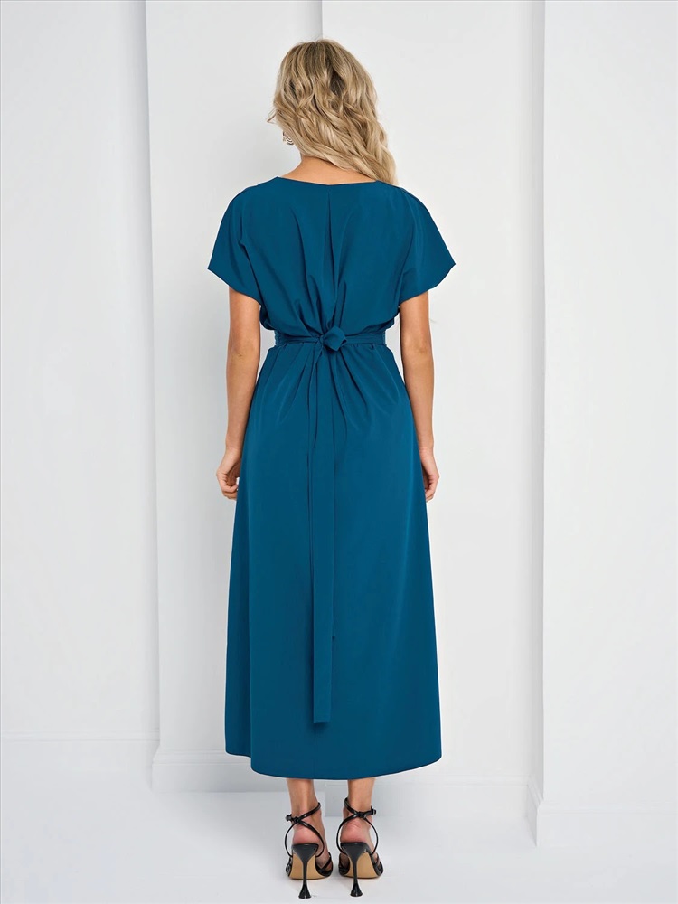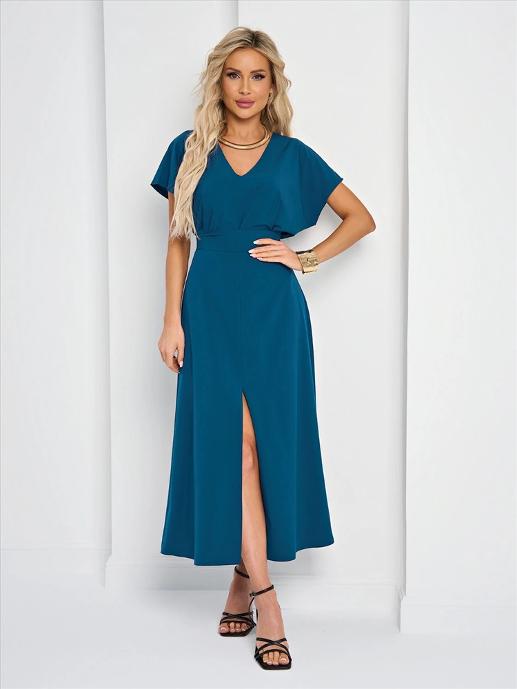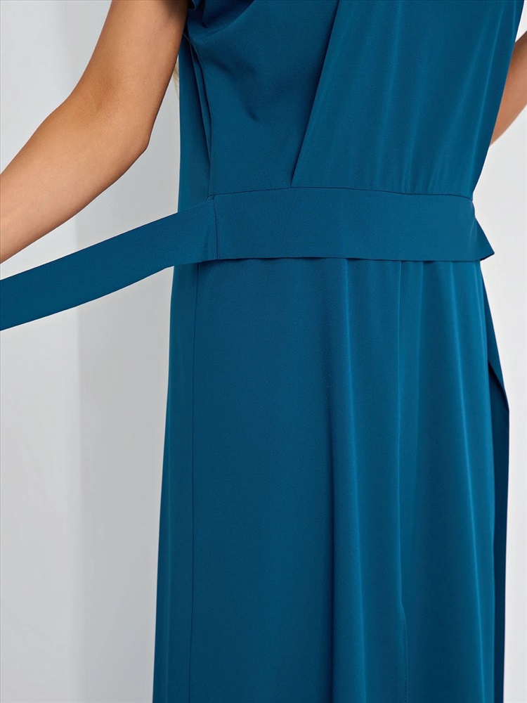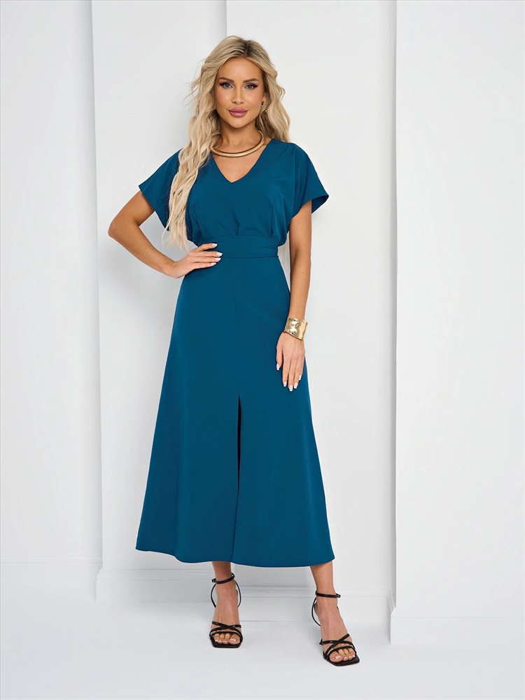 Спинка со средним швом и защипом по центру горловины. Короткий спущенный рукав. V-образный вырез. Разрез спереди. Длина миди. Комментарии к товару