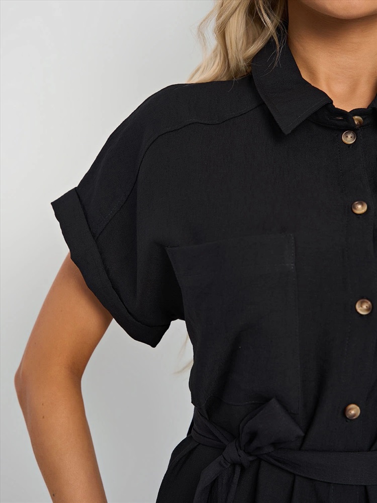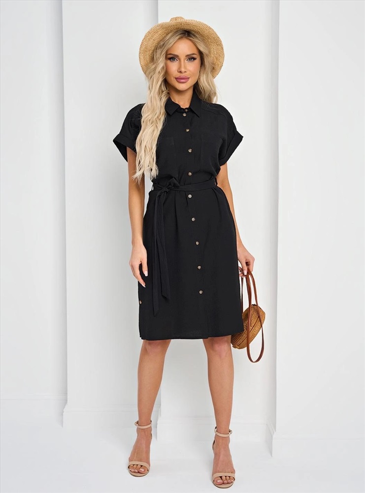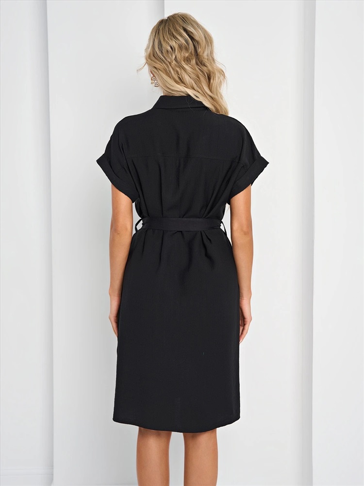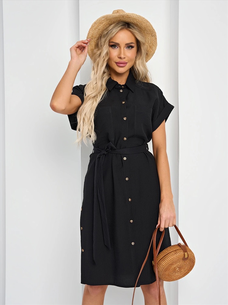 Короткий цельнокроеный рукав на широкой манжете. Воротник рубашечного типа. В боковых швах расположены декоративные планки с роговыми пуговицами. Спинка с отрезной кокеткой. В комплекте имеется декоративный пояс. Комментарии к товару