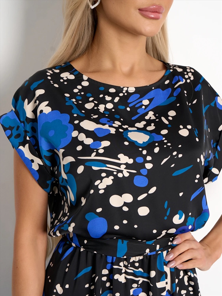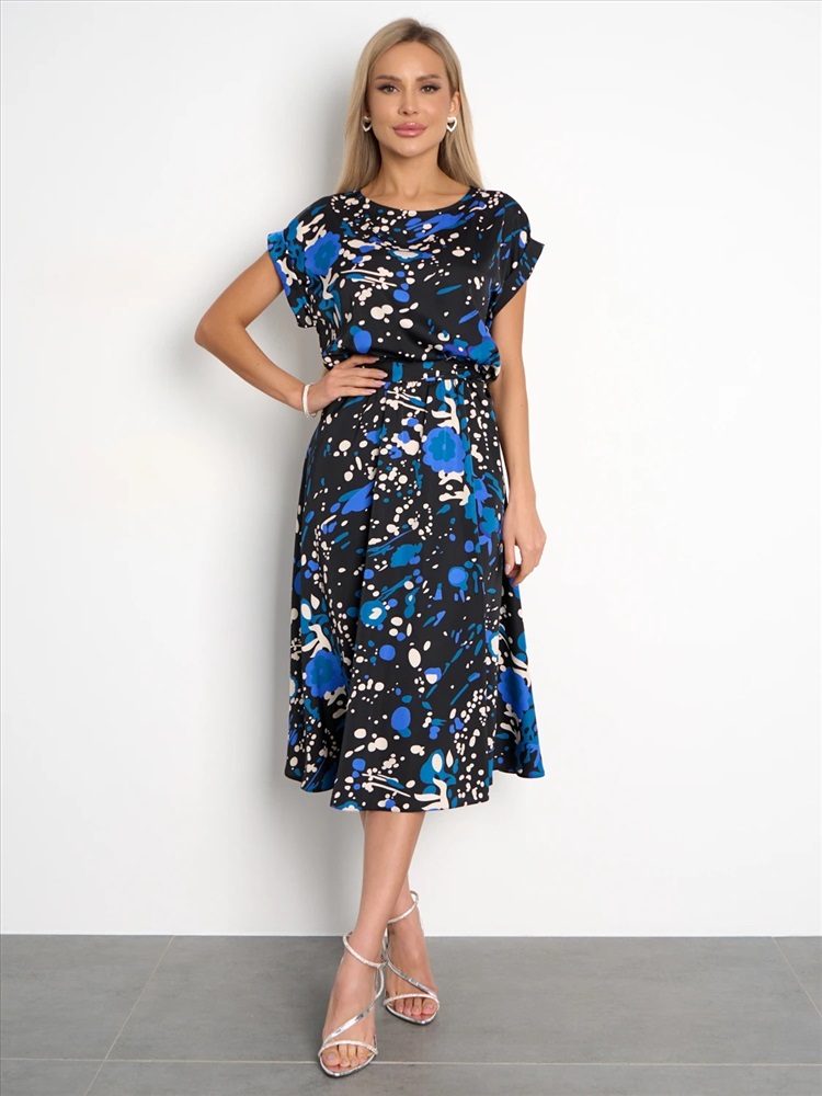 Пояс на внутренней резинке. В комплект идет пояс в цвет платья. Низ изделия расклешенный. Короткий цельнокроеный рукав с отворотом. Комментарии к товару