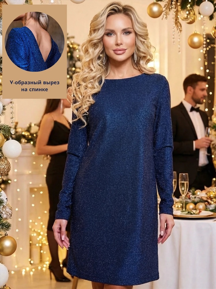 Трикотажное платье полуприлегающего силуэта длины выше колена. Круглый вырез горловины. Длинные втачные рукава.