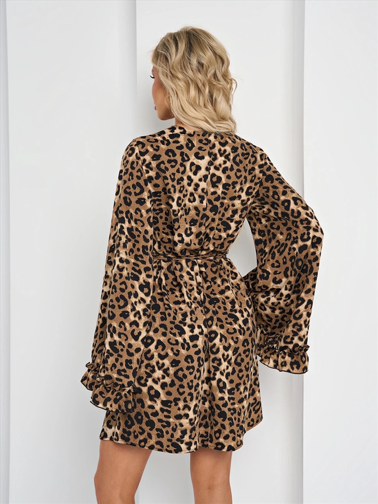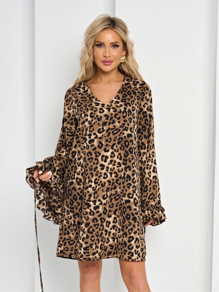 V-образный вырез. Длинные рукава клеш с воланами на манжетах. Классический анималистический принт в виде леопардовых пятен. Длина выше колена. Комментарии к товару