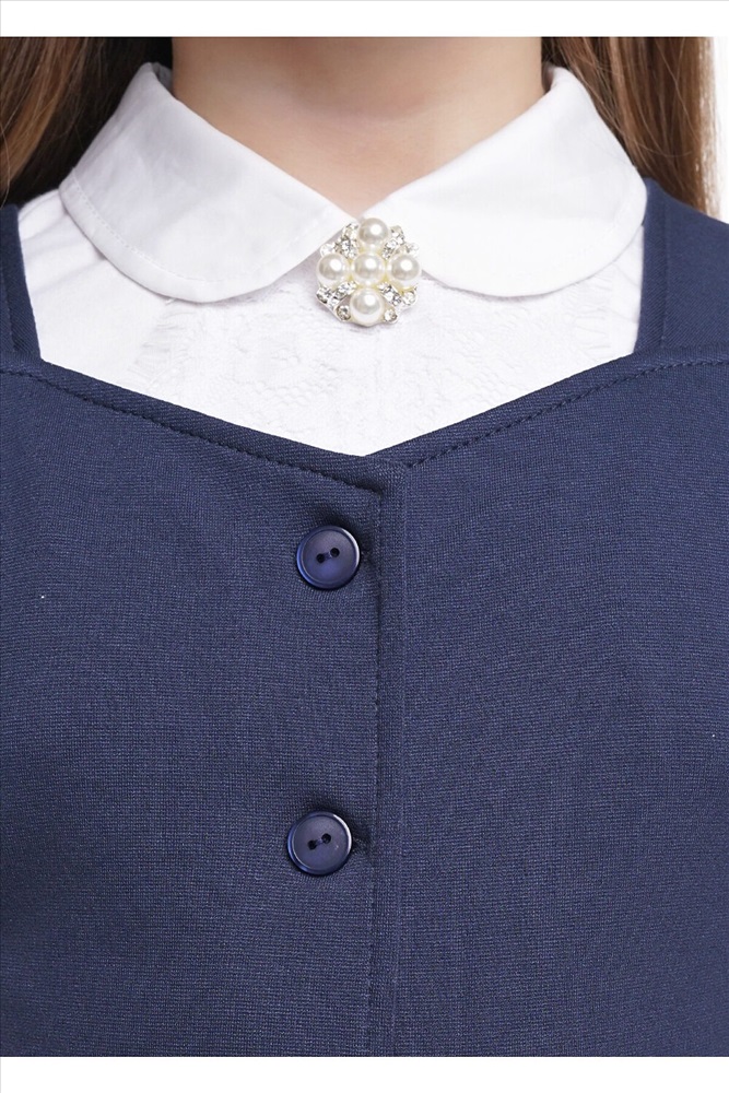 Практичное платье из джерси со съемным воротником, приталенного силуэта. Украшает модель небольшой декор из страз. Состав: 70% Вискоза, 22% Полиэстер, 8% Эластан