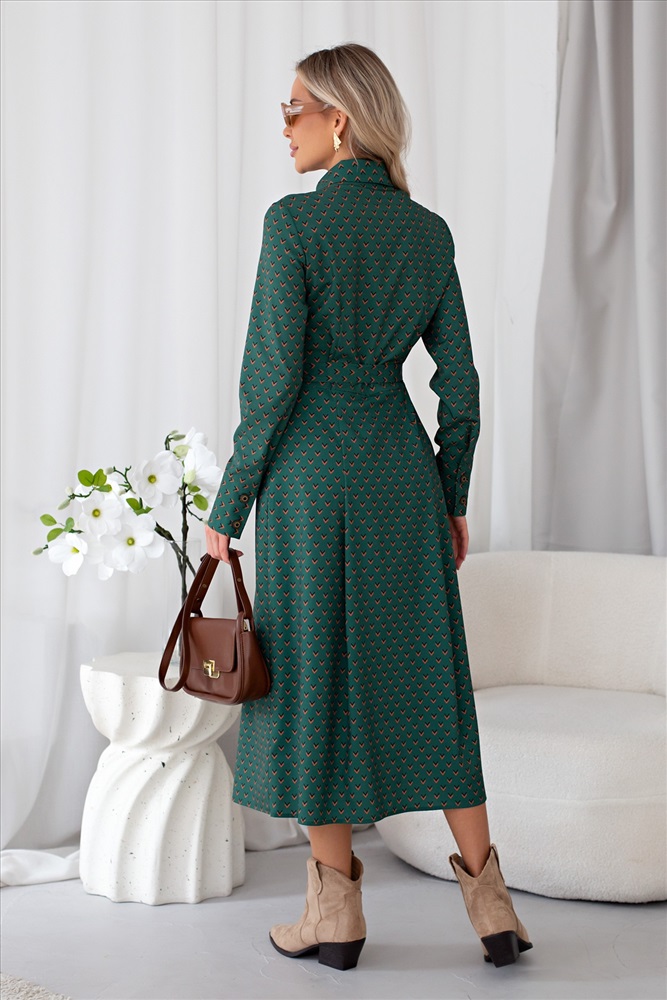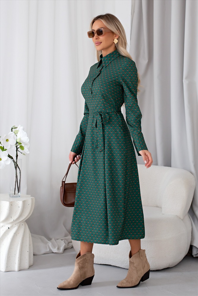 Платье длинное зелёное с поясом от компании Valentina. Модель приталенного силуэта, выполнена из плательного полотна с принтом. Горловина оформлена отложным воротником на стойке. По переду втачная планка с застежкой на петли и пуговицы. Длинный втачной рукав оканчивается притачной манжетой. Модель отрезная по линии талии, с боку застежка на потайную молнию. Юбка дополнена встречными складками. Модель прекрасно дополнит Ваш гардероб. Рекомендуемая стирка при температуре не более 30 C., Оттенок цвета и расположение рисунка могут незначительно отличаться от фото., Ожидание отправки (рабочих дней): 8, Длина: 120 см., Размер модели: 42., Рост модели: 168 см., Состав:, Полиэстер 95%, Эластан 5%, Тип ткани:, Плательная ткань