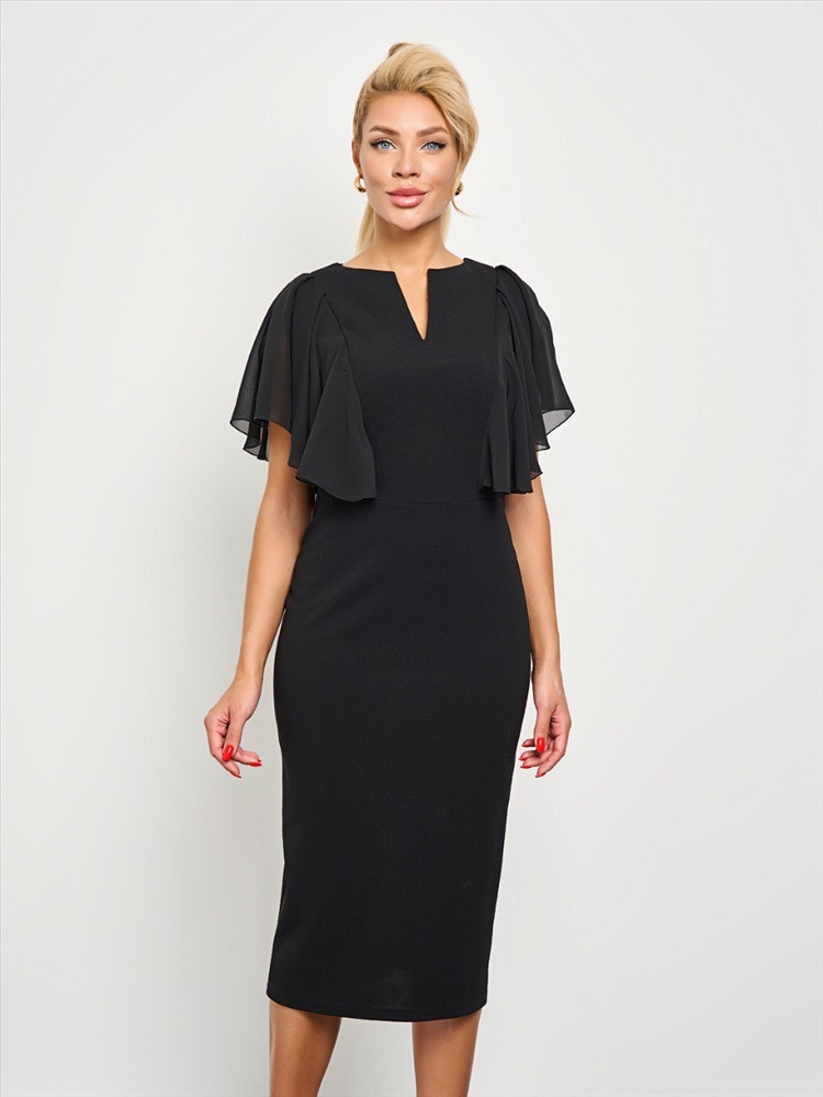 Платье-футляр трикотажное чёрное с рукавами из шифона от производителя Jetty. Модель прилегающего силуэта, круглый вырез горловины переходит в V-образный разрез. Линия талии отрезная. По спинке разрез. Идеальный выбор для создания вечернего образа., Оттенок цвета может незначительно отличаться от фото., Длина: 112 см., Размер модели: 42., Рост модели: 170 см., Состав:, Полиэстер 95%, Эластан 5%, Тип ткани:, Трикотаж+шифон