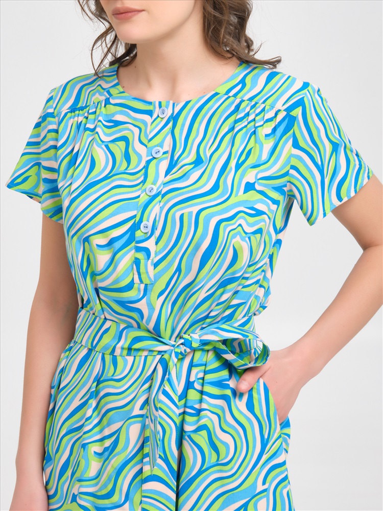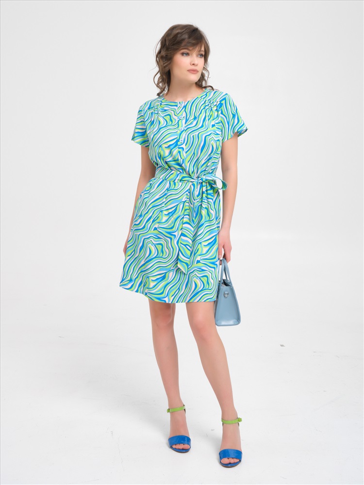 Платье голубое с коротким рукавом от бренда Priz, выполнено из текстильного полотна. Модель А-образного силуэта. Перед с кокетками, под кокетками сборка. В верхней части переда обработана планка с застёжкой на пуговицы. В боковых швах карманы. Талия подчёркнута завязывающимся поясом из основной ткани. Стильный вариант для создания модного образа., Оттенок цвета и расположение рисунка могут незначительно отличаться от фото., Ожидание отправки (рабочих дней): 7, Длина: в 42 р-ре - 99 см, в 54 р-ре - 102,5 см., Размер модели: 44., Рост модели: 174 см., Состав:, Вискоза 100%, Тип ткани:, Текстиль