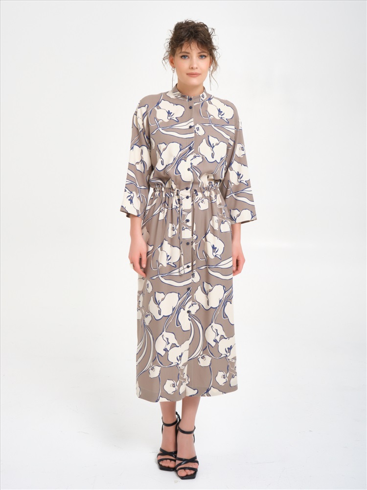 Платье из вискозы с принтом, от бренда Priz., Спереди планка с застёжкой на кнопки. Спинка с кокеткой. Воротник стойка. Плечо спущенное. Рукав длиной 3/4. Талия подчёркнута кулисой, в которую вставлен шнур из основной ткани с резиной и фиксаторами. В боковых швах карманы., Элегантность и стиль в одной модели., Оттенок цвета и расположение рисунка могут незначительно отличаться от фото., Ожидание отправки (рабочих дней): 7, Длина: в 42 р-ре - 122 см, в 54 р-ре - 125 см., Размер модели: 44., Рост модели: 174 см., Состав:, Вискоза 100%, Тип ткани:, Текстиль