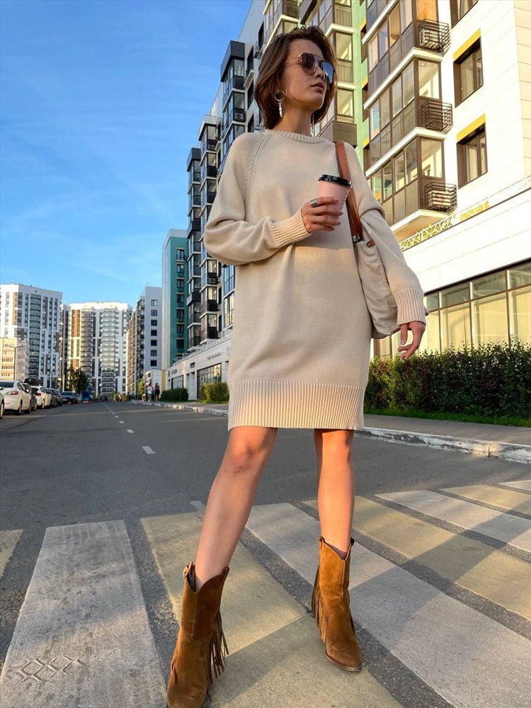 Рукава реглан, манжеты по низу и рукавам. Дополнить образ можно высокими ботфортами или грубыми сапогами.