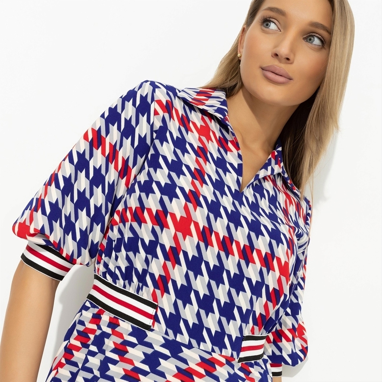 Гусиная лапка вышла на новый модный уровень. Из монохромного орнамента она превратилась в яркий принт благодаря дизайнерам CHARUTTI. Теперь платье будет видно издалека. Платье приталенного силуэта в длине миди. Акцент из контрастной резинки на талии и на рукавах изделия. Ворот в стиле поло.
