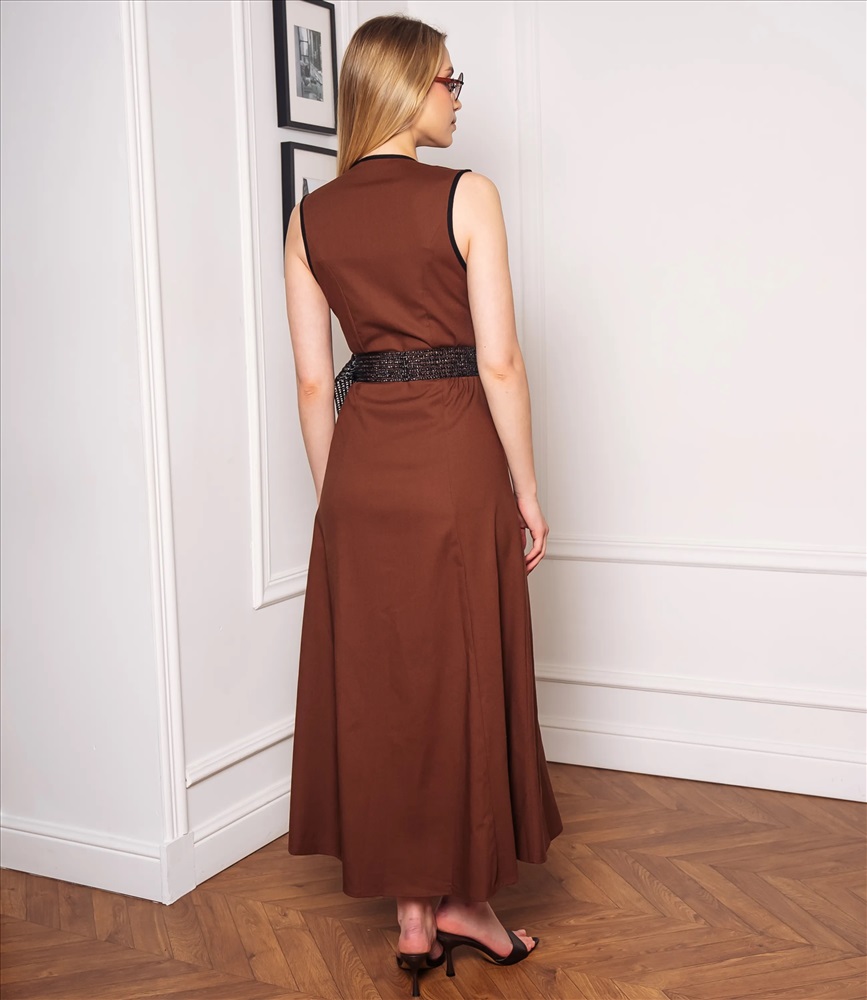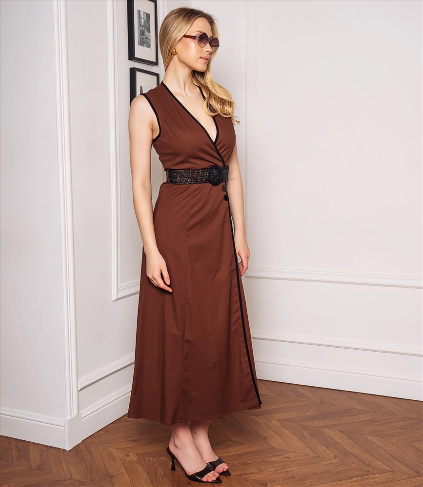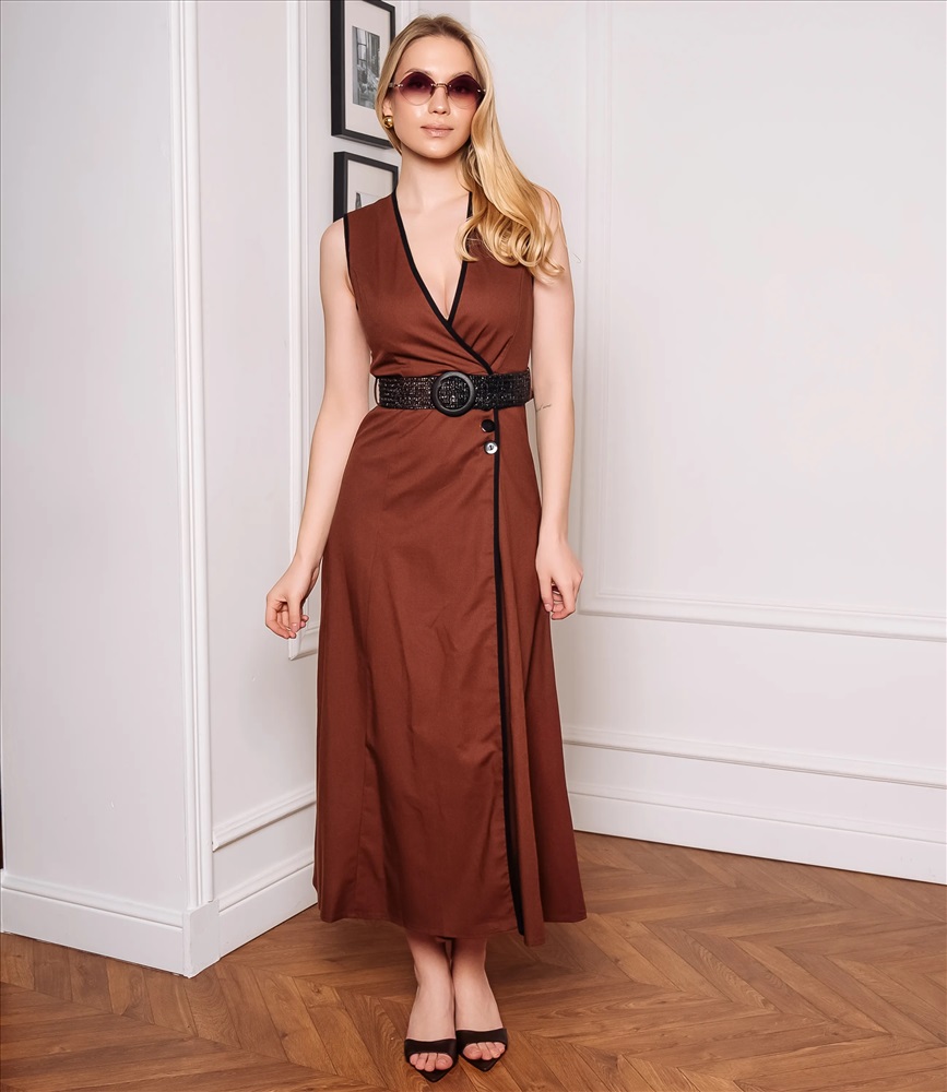 Платье — это незаменимый элемент гардероба, который подчеркивает женственность каждой девушки. Платье миди без рукавов с элегантным лаконичным кроем. Верх оформлен глубоким V-образным вырезом, акцентированным контрастной отделкой по краям, которая плавно переходит в вертикальную линию, идущую вдоль передней части изделия до подола. Лиф выполнен с запахом, что создаёт дополнительный акцент на талии. Силуэт подчёркивает широкий пояс с крупной пряжкой, добавляющий образу строгости и завершённости. По передней части платья вертикально расположены декоративные пуговицы, усиливающие структурность дизайна. Юбка свободная, слегка расклёшенная. Для пошива использовали 100% хлопок, что обеспечивает не только комфорт, но и отличный внешний вид. Обратите внимание на насыщенные цвета и текстуру материала, которые отлично переданы на фотографиях на сайте. Для уверенности в выборе размера мы представили на странице таблицу измерений. Воспользовавшись ею, ваши клиентки смогут легко подобрать нужный размер. Предложенная цена на это платье является доступной для оптовых покупателей, что делает его отличным дополнением к вашему ассортименту. Не упустите возможность предложить своим клиентам стильное и комфортное платье, которое подчеркнет их индивидуальность и сделает их неотразимыми!
