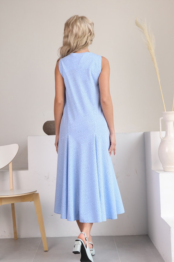 Обаятельное платье полуприлегающего силуэта из текстильного полотна голубого цвета. Фигурный вырез и проймы рукавов обработаны внутренней обтачкой. Юбка изделия дополнена клиньями. Аксессуары в комплект не входят. Длина изделия по спинке от плечевого шва до низа изделия — 118 см. Рост фотомодели — 170 см.
