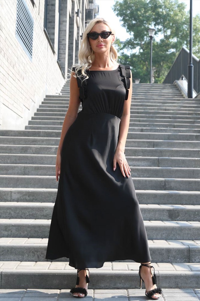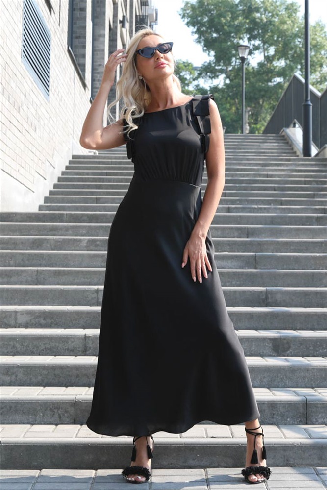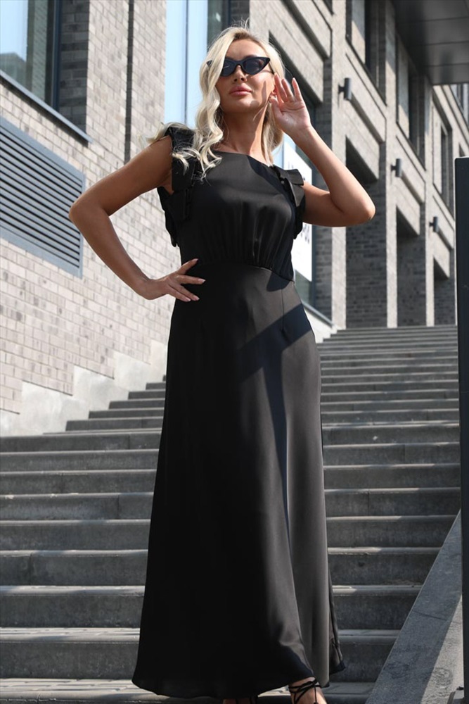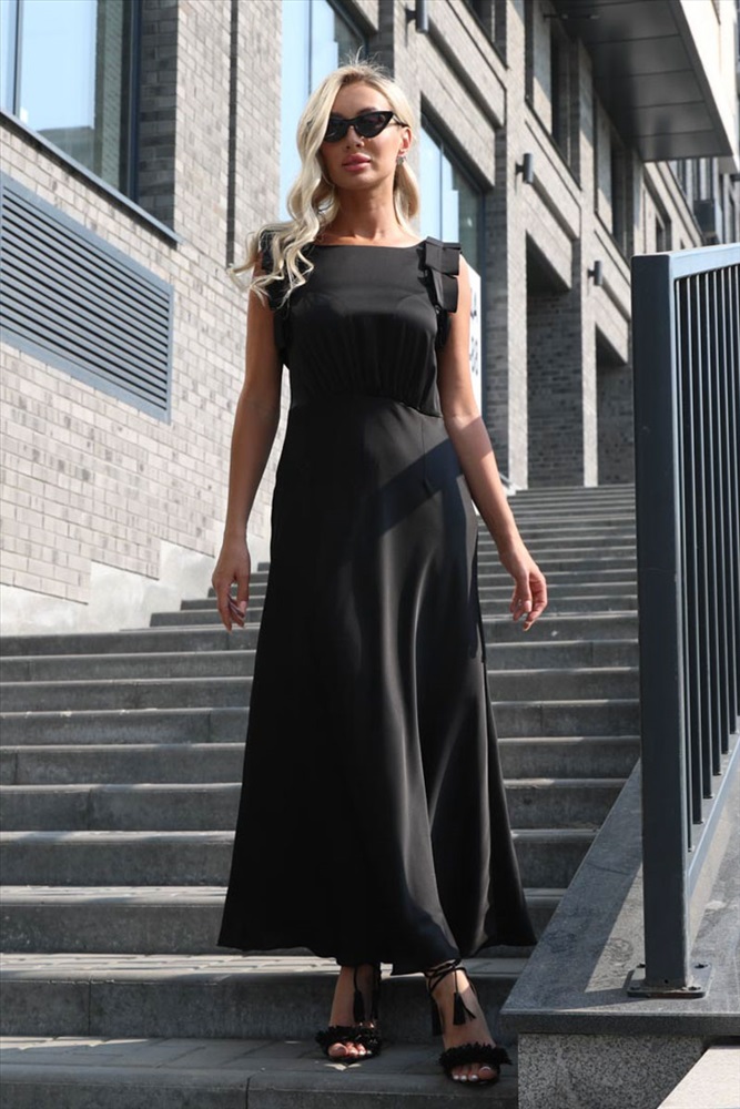 Очаровательное платье полуприлегающего силуэта из текстильной ткани черного цвета. Круглый вырез изделия обработан внутренней обтачкой. Проймы рукавов дополнены декоративной отделкой. Платье отрезное по линии талии. Линия талии завышена и эффектно подчеркнута сборкой. Длина изделия по спинке от плечевого шва до низа изделия — 132 см. Рост фотомодели — 170 см