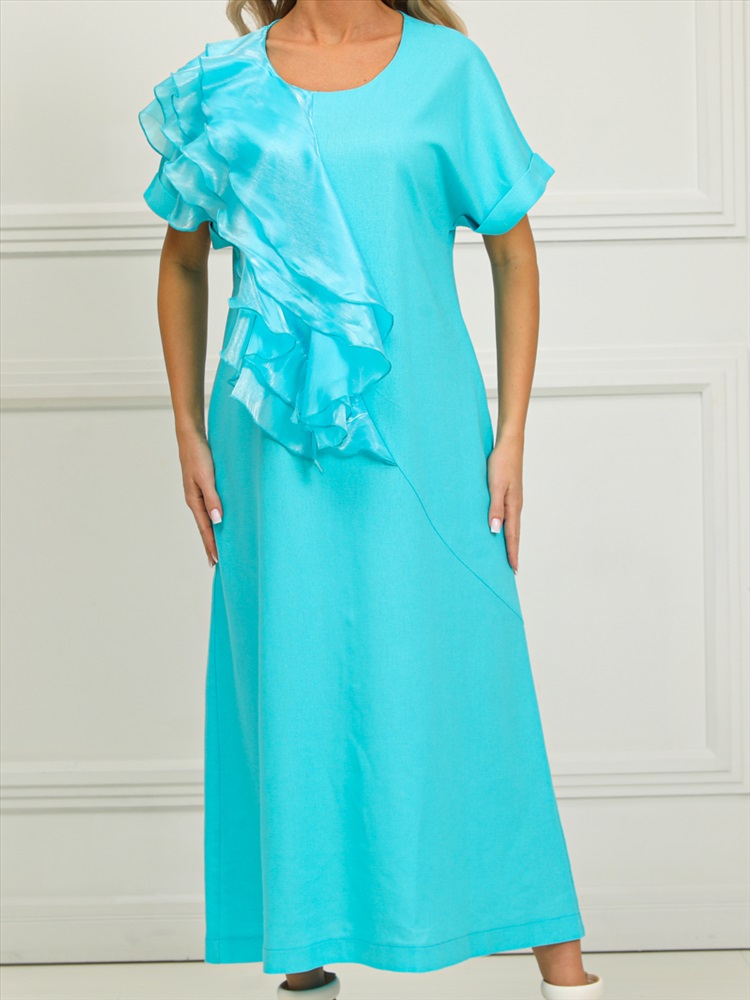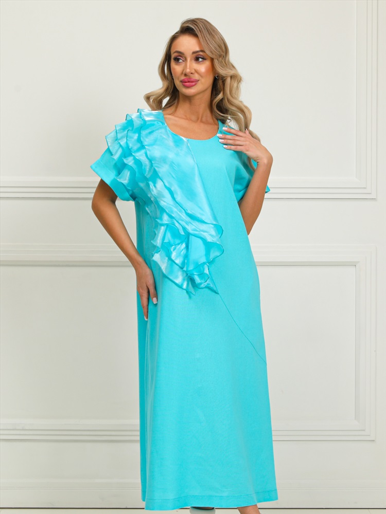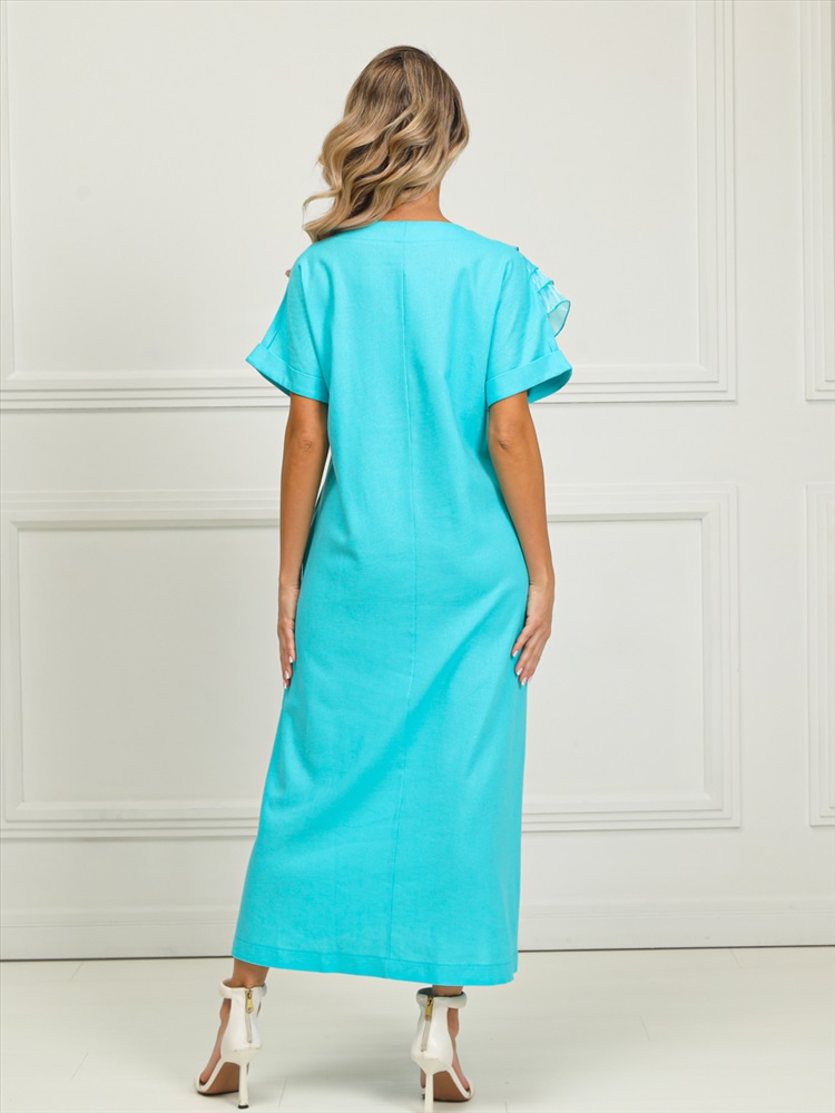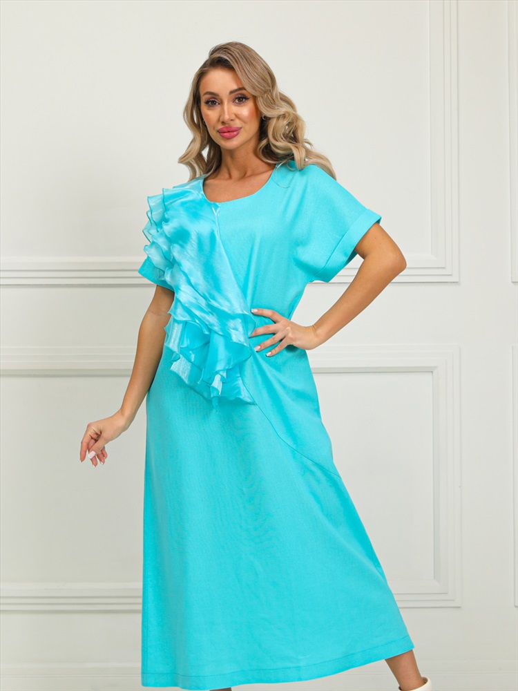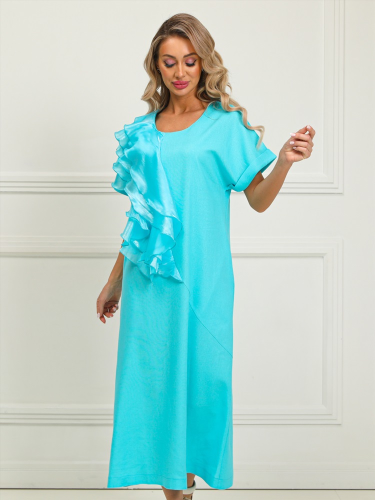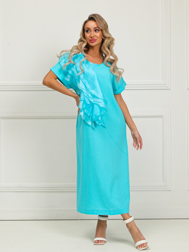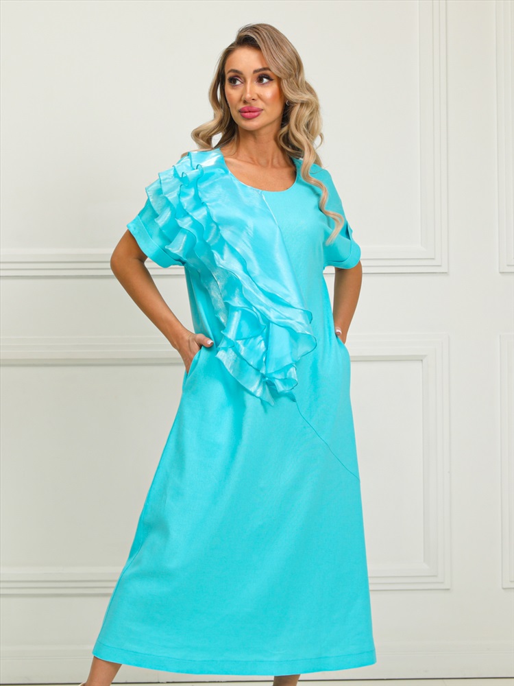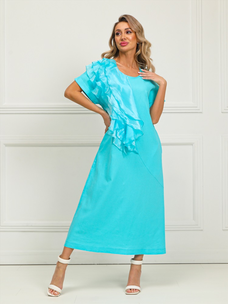 Очаровательное платье прямого силуэта из текстильной ткани голубого цвета. Круглый вырез изделия обработан внутренней обтачкой. Цельнокроеные рукава дополнены отворотом. Перед изделия дополнен широкими оборками из шифона. По бокам изделия - внутренние карманы. Длина изделия по спинке от плечевого шва до низа изделия — см.