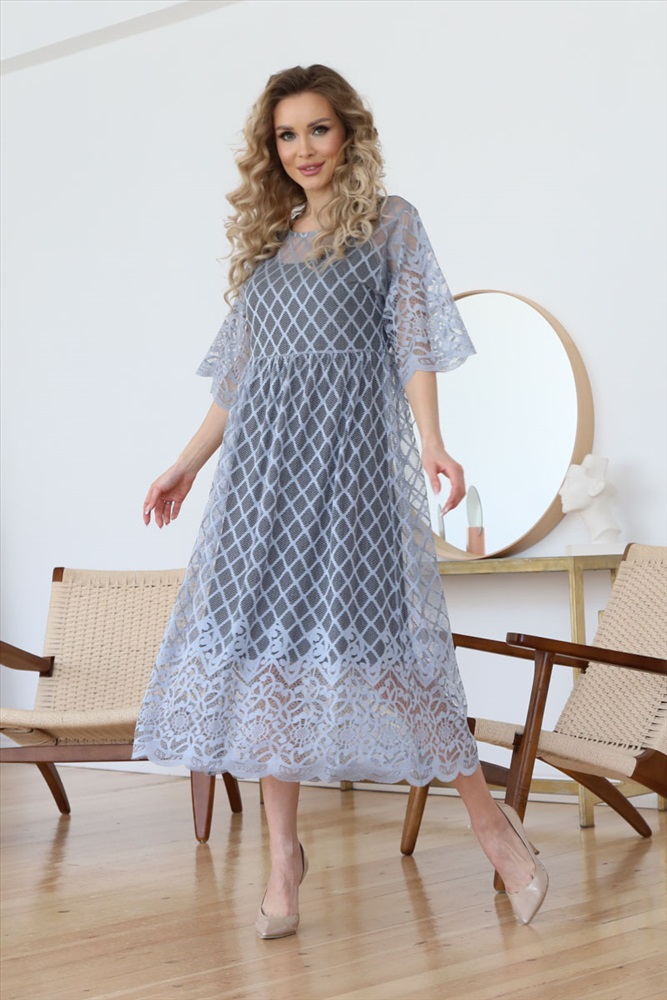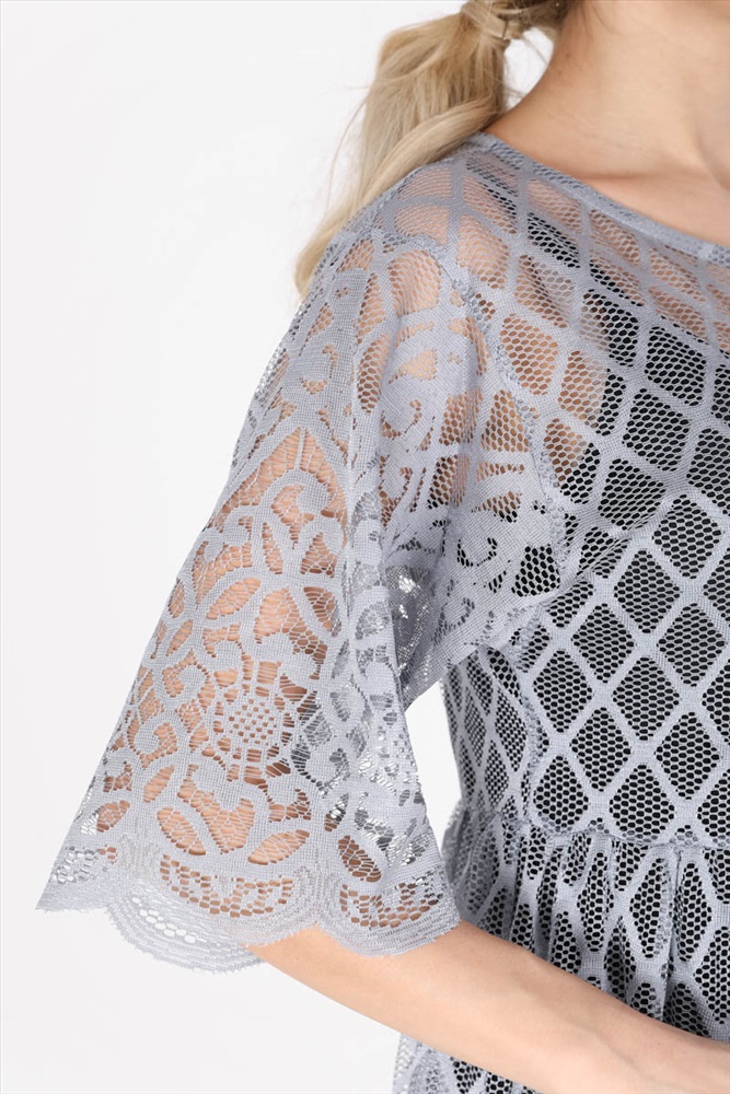 Нежное платье свободного силуэта из кружевного полотна серого цвета. Круглый вырез изделия обработан косой бейкой. Платье с втачными рукавами. Изделие отрезное по линии талии. Линия талии завышена и дополнена сборками. Платье двойное: верхняя часть выполнена из кружевного полотна серого цвета. Снизу однотонный подклад из трикотажного полотна черного цвета на тонких бретелях.