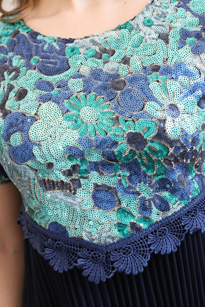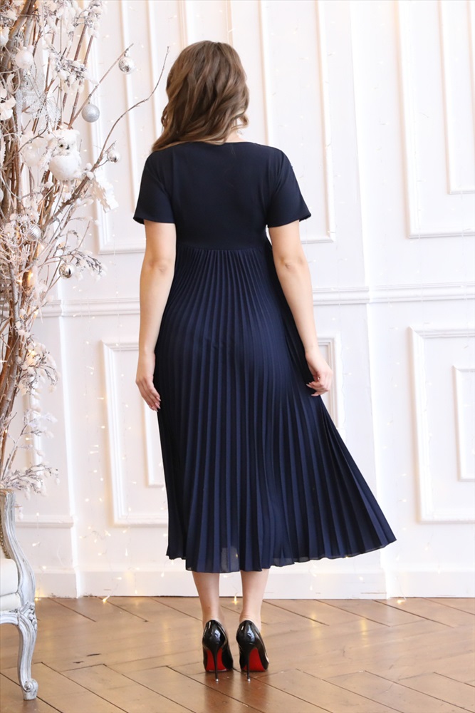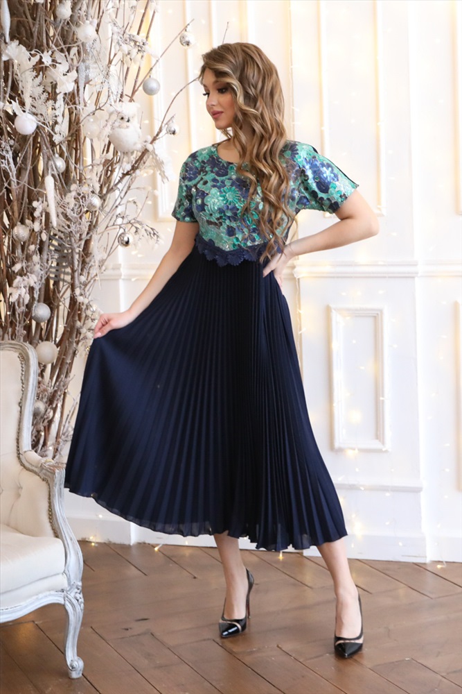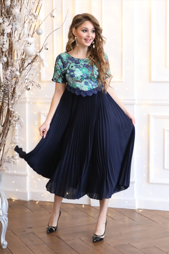 Роскошное платье полуприлегающего силуэта из текстильного полотна. Круглый вырез изделия обработан внутренней обтачкой. Платье с цельнокроеными рукавами. Платье отрезное, линия талии завышена. Верх изделия двойной: верхняя часть выполнена из кружевного полотна серого цвета и посажена на тонкий однотонный текстильный подклад. Юбка выполнена из гофрированного текстильного полотна цвета. Нижний край юбки обработан швом «закрутка».
