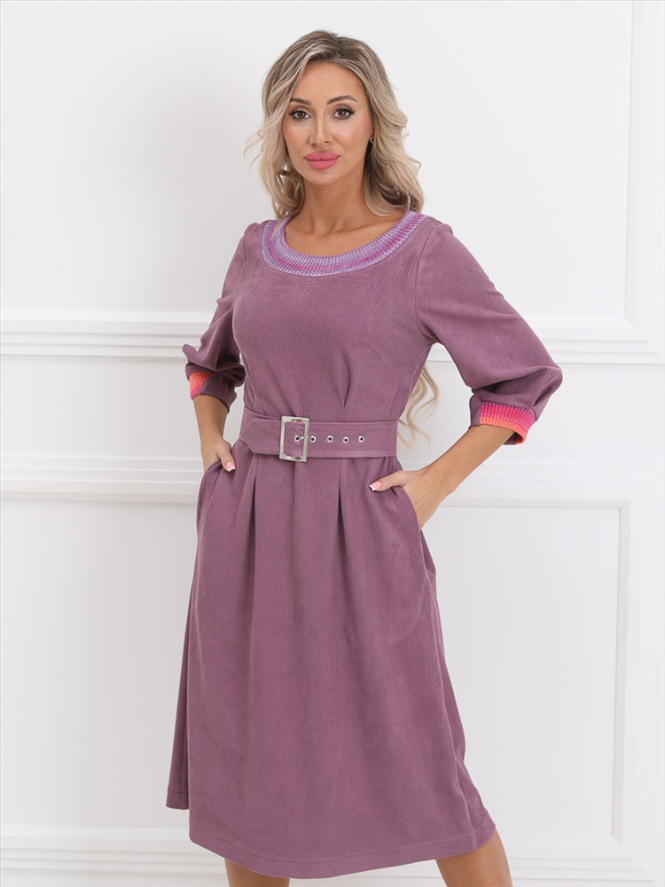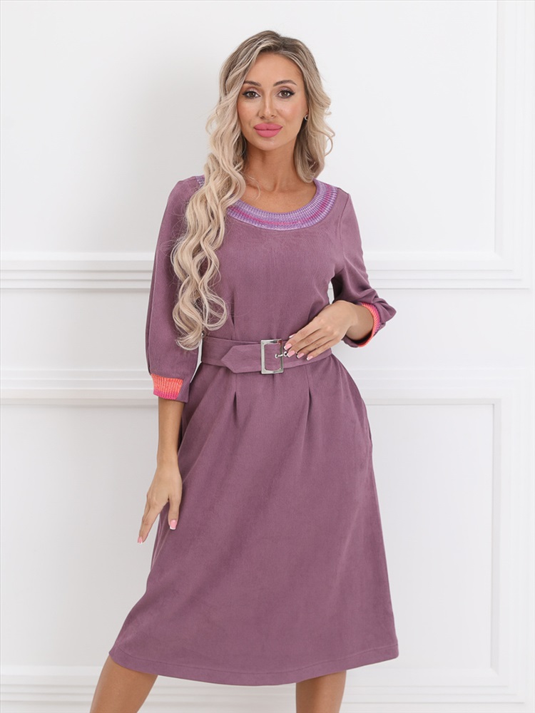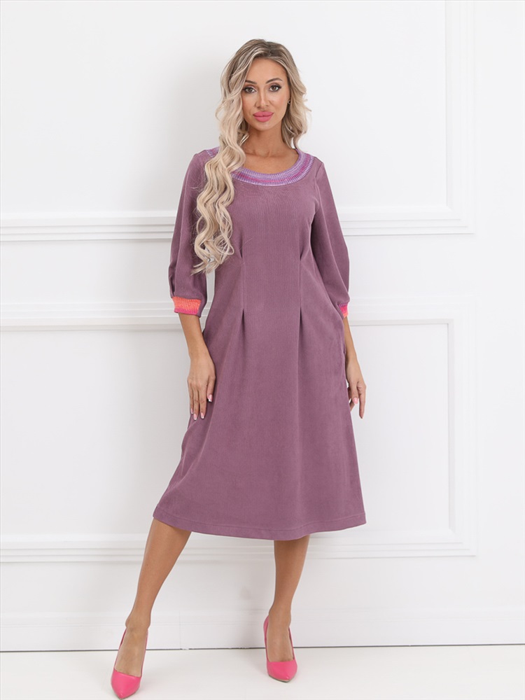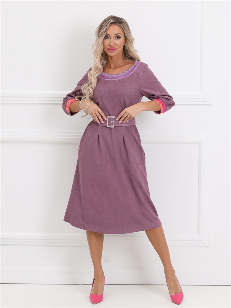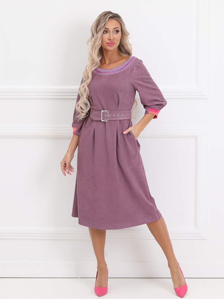 Очаровательное платье прямого силуэта из текстильной ткани сиреневого цвета. Круглый вырез издия обработан обтачкой, выполненной в технике ручного вязания. Втачные рукава дополнены складками и обработаны манжетами. Линия талии завышена, эффектно подчеркнута вертикальными складками. По бокам изделия - внутренние карманы. В комплект входит пояс с металлической пряжкой. Длина изделия по спинке от плечевого шва до низа изделия - 102 см. Рост фотомодели - 170 см.