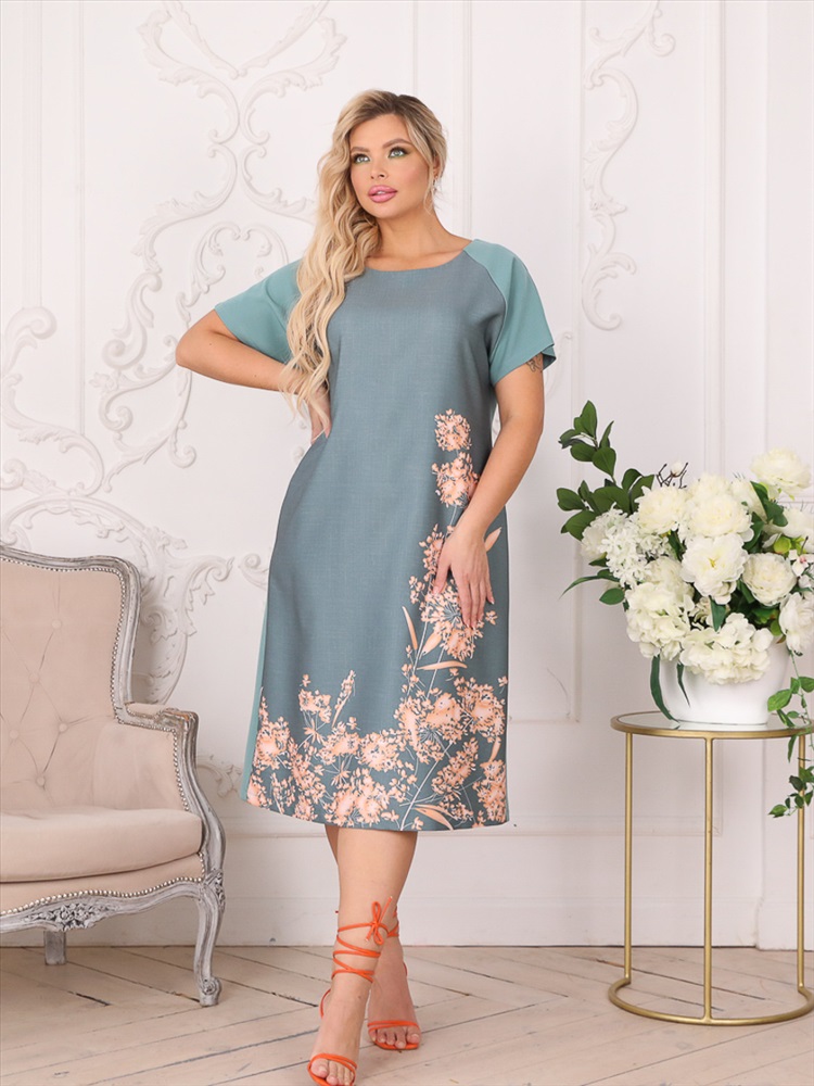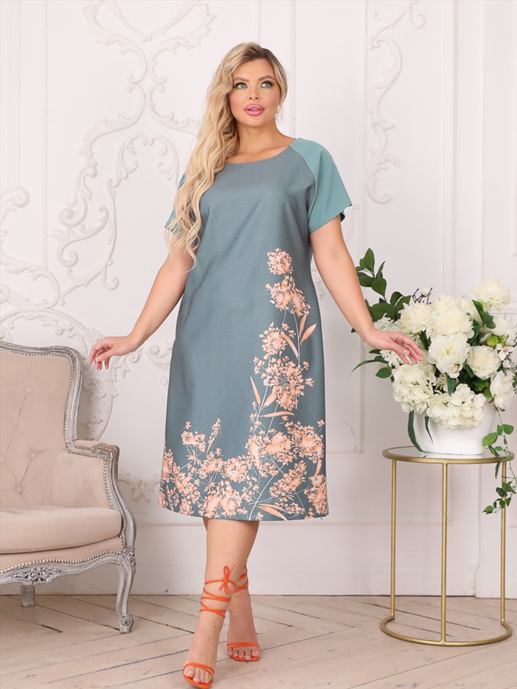 Стильное платья прямого силуэта из текстильной ткани серого цвета с купонным рисунком. Круглый вырез изделия обработан внутренней обтачкой. Платье с рукавами реглан. По бокам изделия внутренние карманы. Длина изделия по спинке от плечевого шва до низа изделия - 110 см. Рост фотомодели - 170 см.